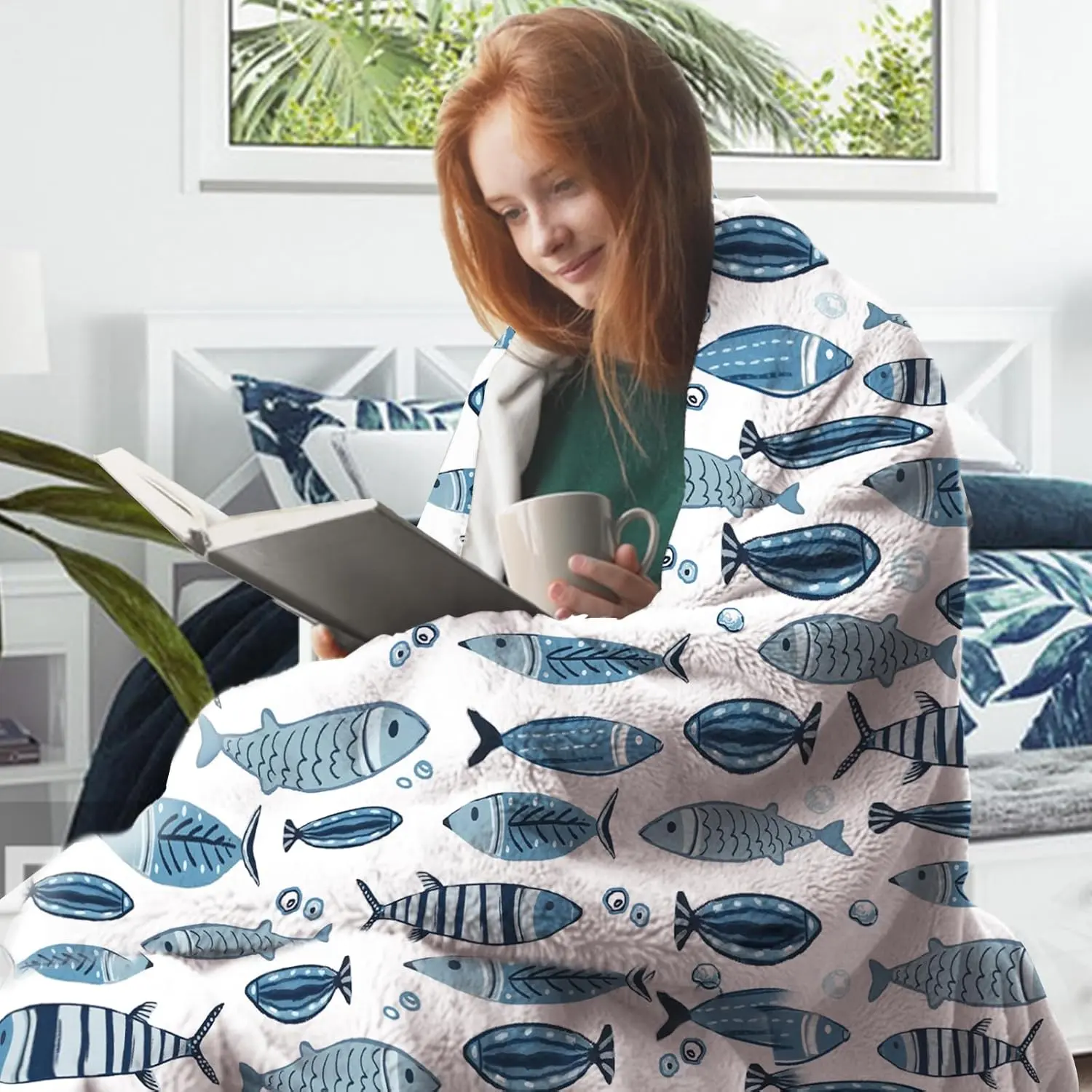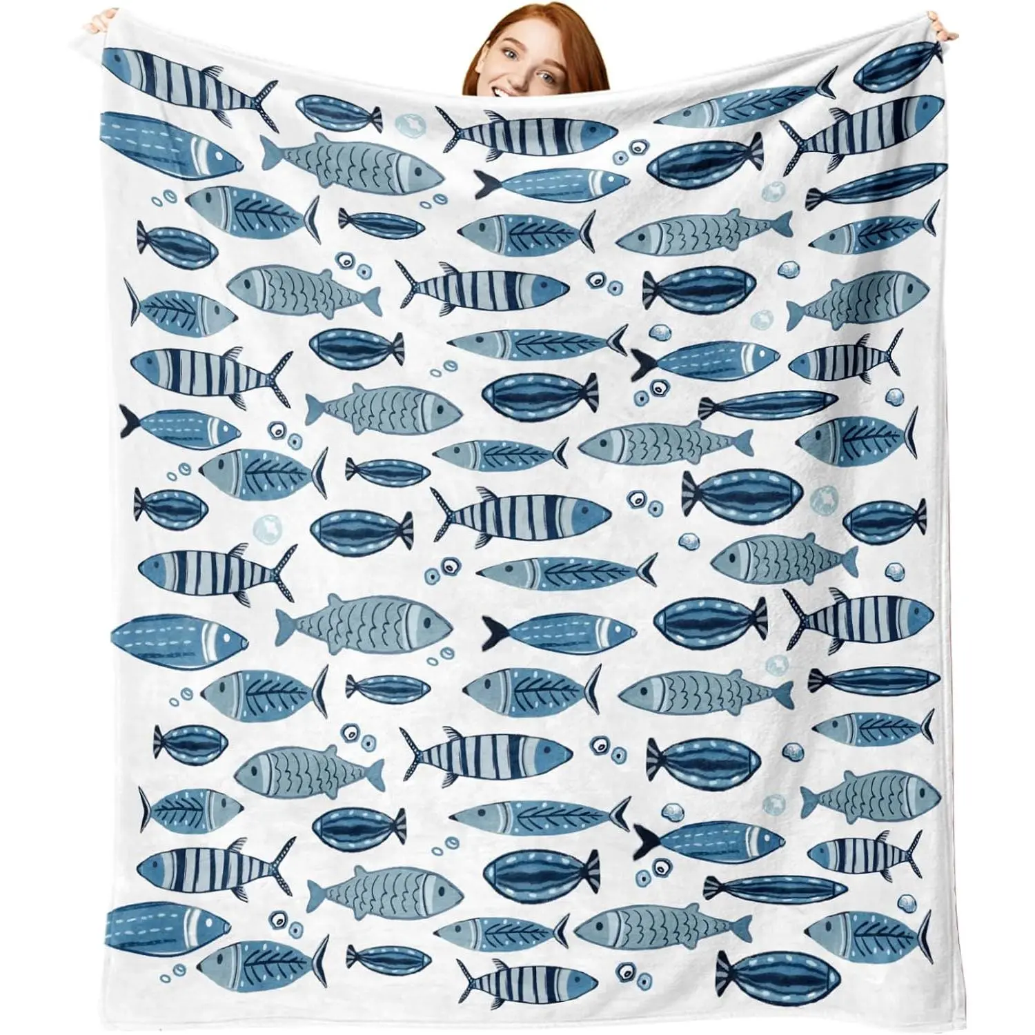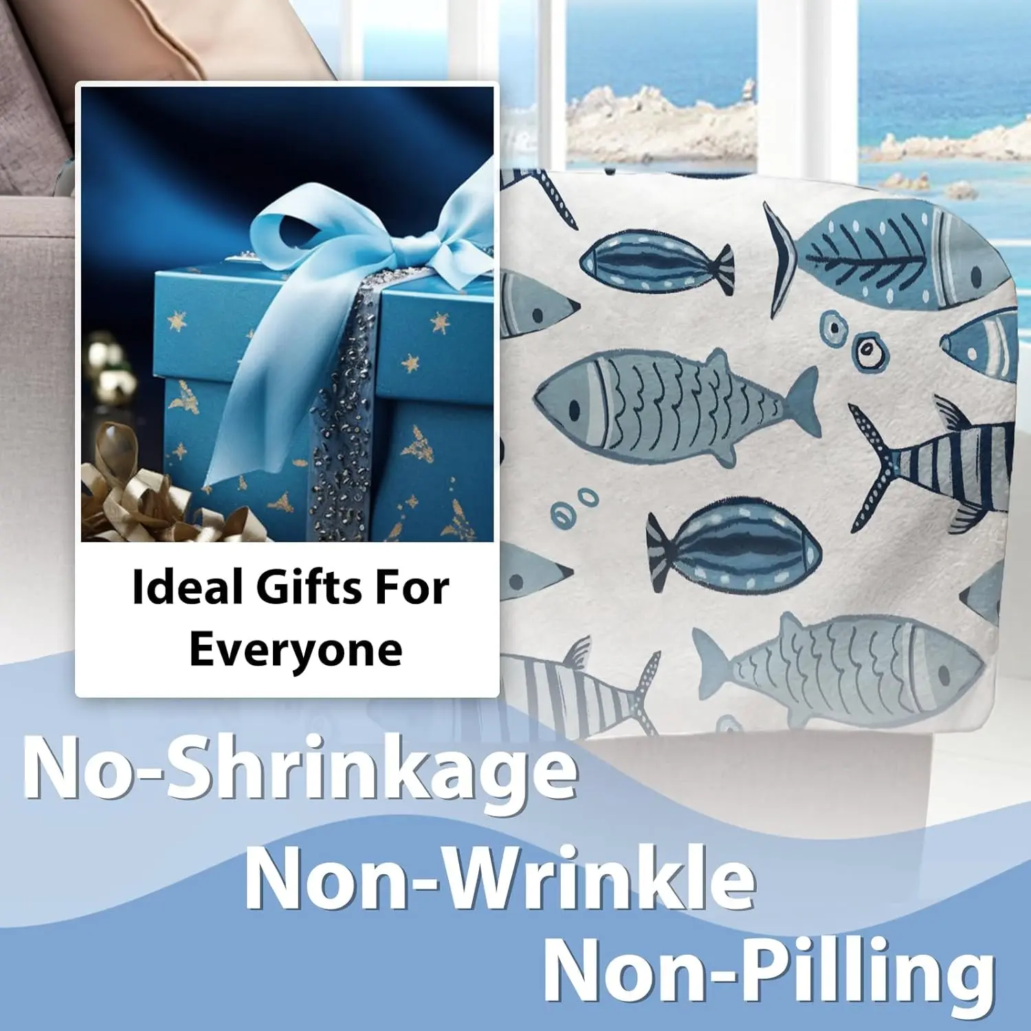 Coastal Blue Fish Theme Flannel Throw Blanket, Sea Ocean Birthday Gifts for Adults Kids Men Women, Beach Nautical Soft Blankets for Bedding Sofa 50" x 60"