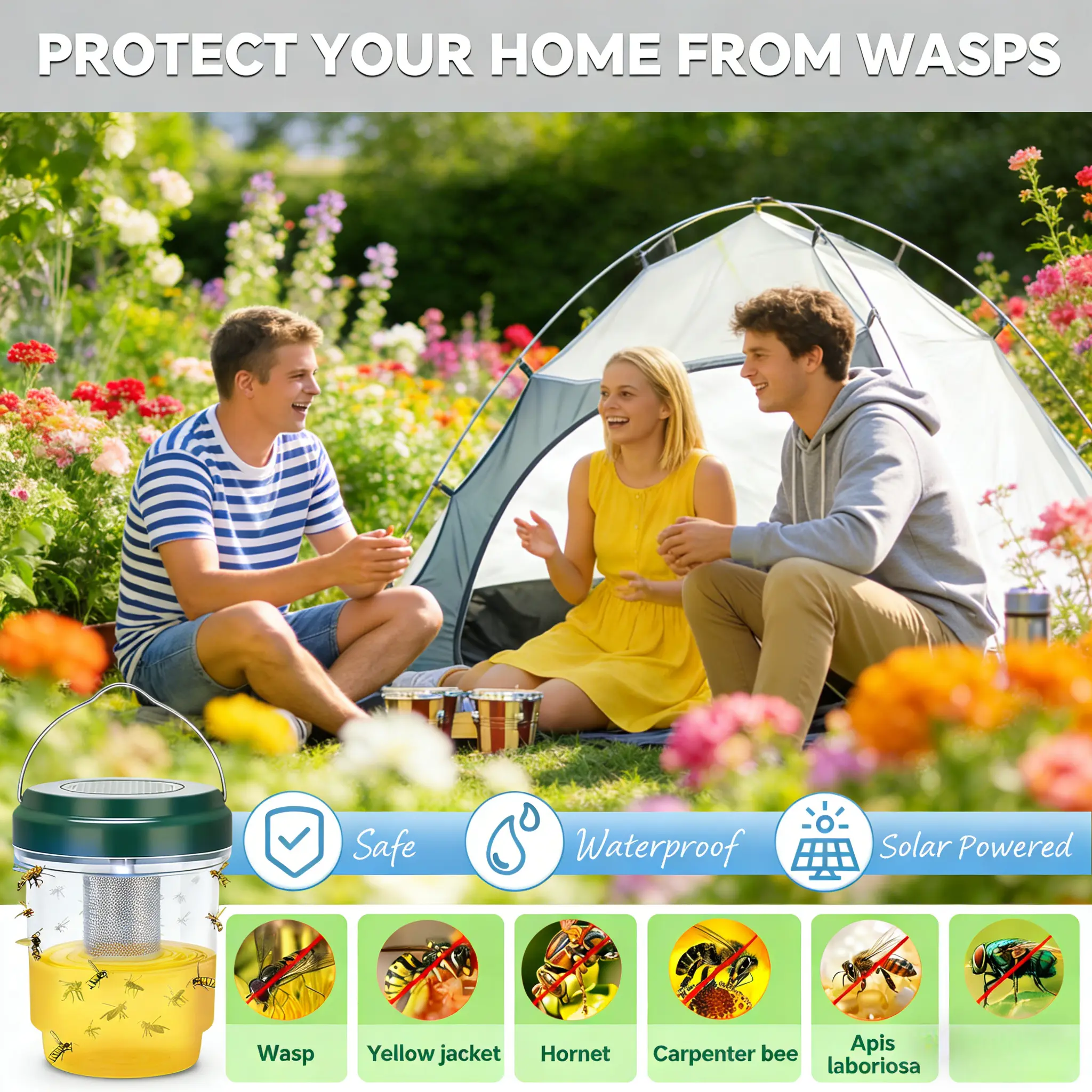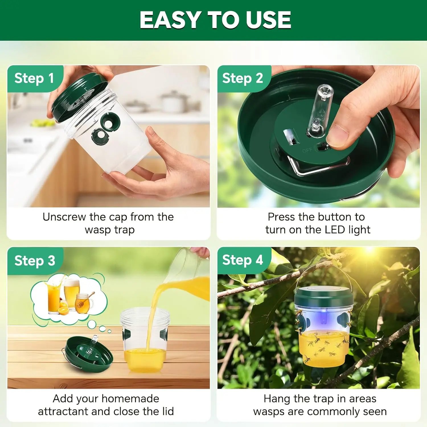 This wasp trap offers a safe way to repel and trap wasps without harmful chemicals. It is perfect for gardens, orchards, farms and various outdoor areas, protecting your space while being safe for humans and pets.