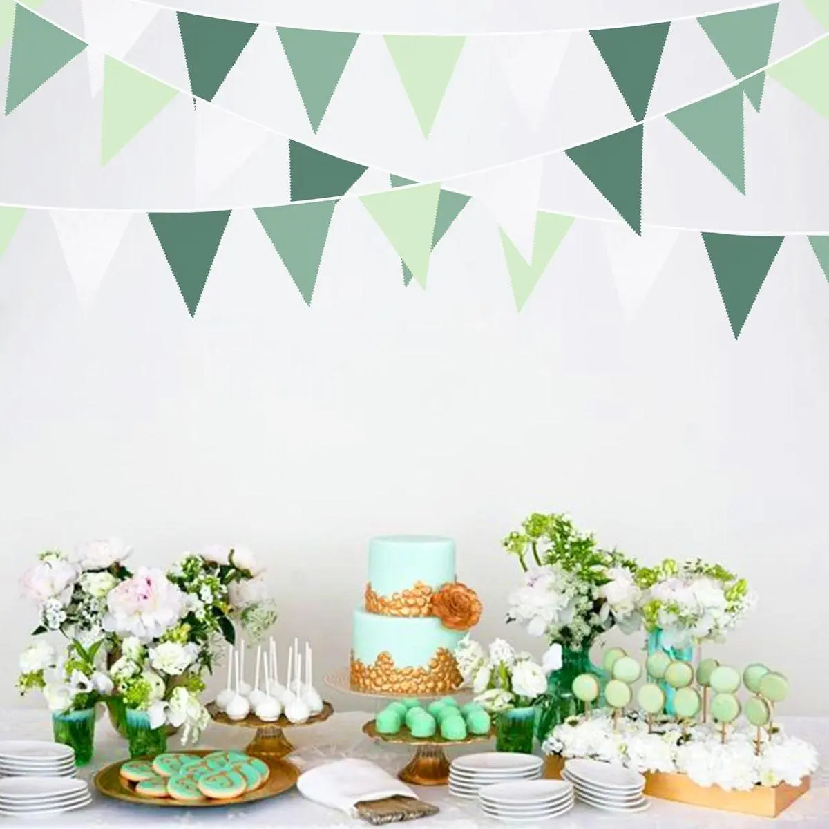 Package Including:1 pack gradient sage green fabric bunting banner garland in christmas dark green, green, light green and white colors, with 36pcs flags in 10M/32.8Feet. Flag Size: 5.5in width x 7in height.