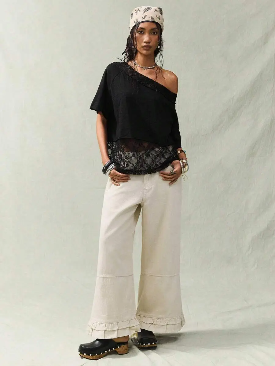 Bohemela Boho Vintage Casual Solid Color Knit Lace Off Shoulder Flare Sleeve Fitted Women Top
