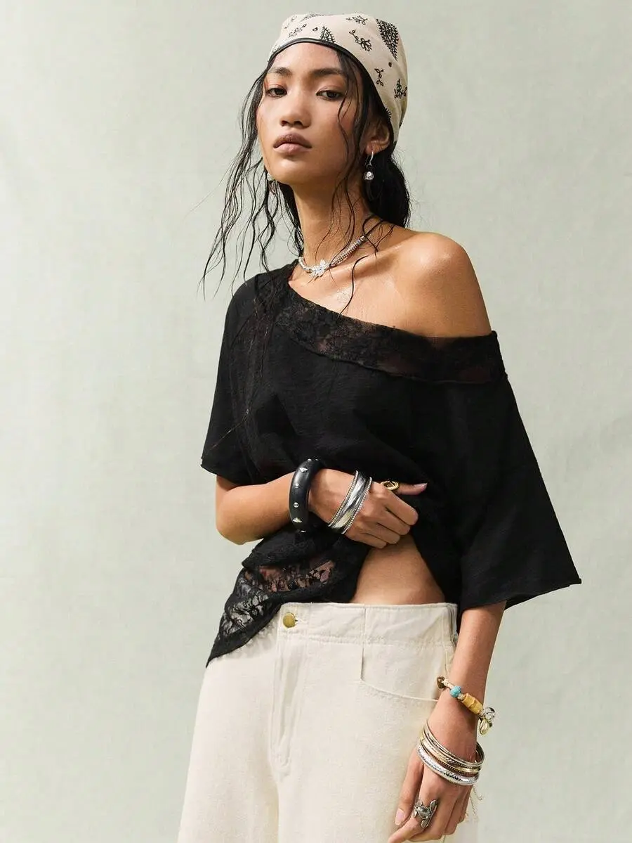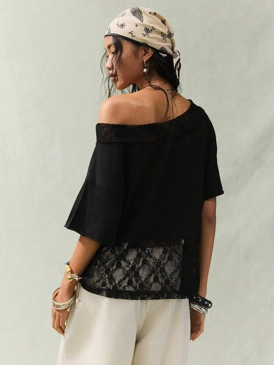 Bohemela Women's Lace Patchwork Asymmetric Collar Top Black Lace Short Sleeve Asymmetrical Shoulder Top