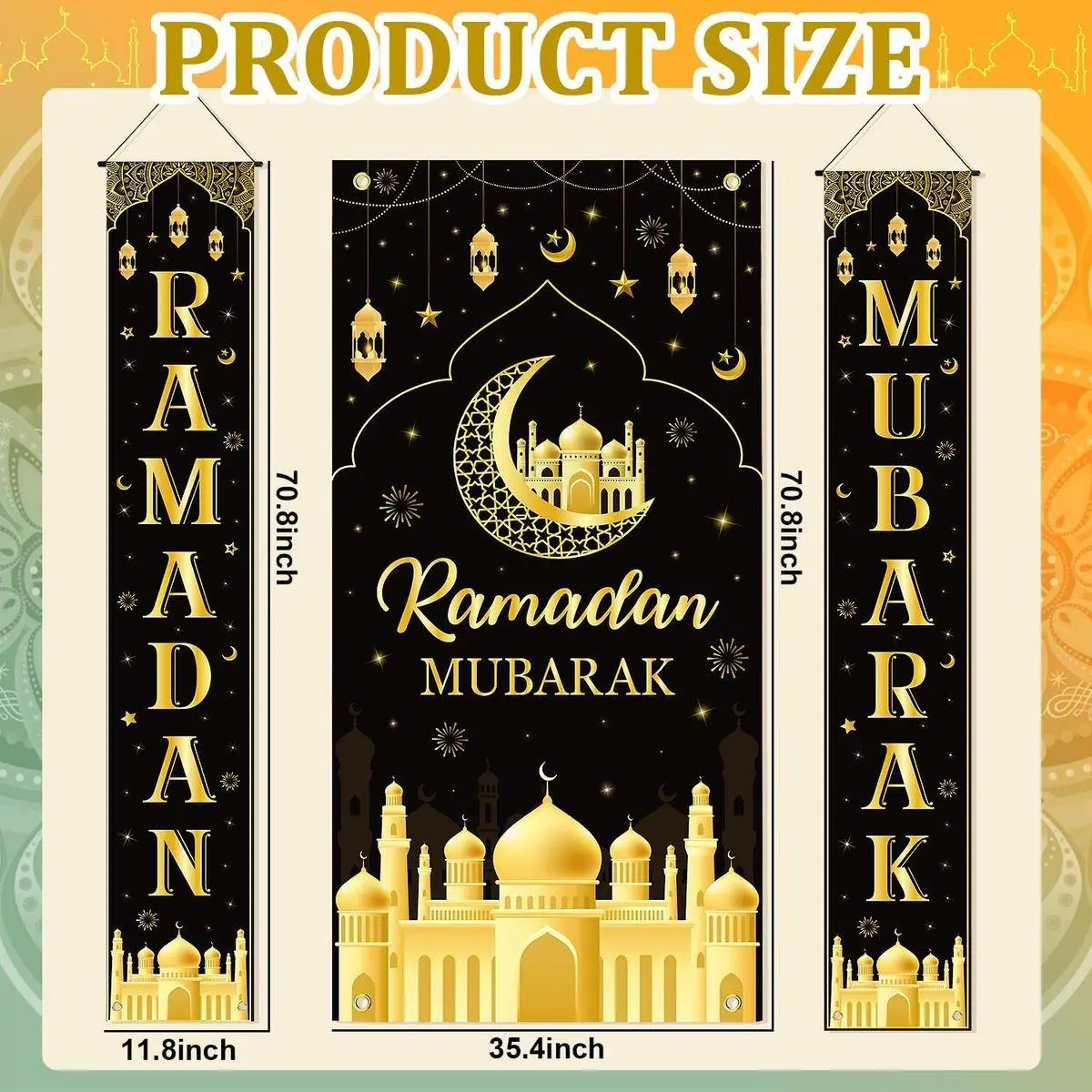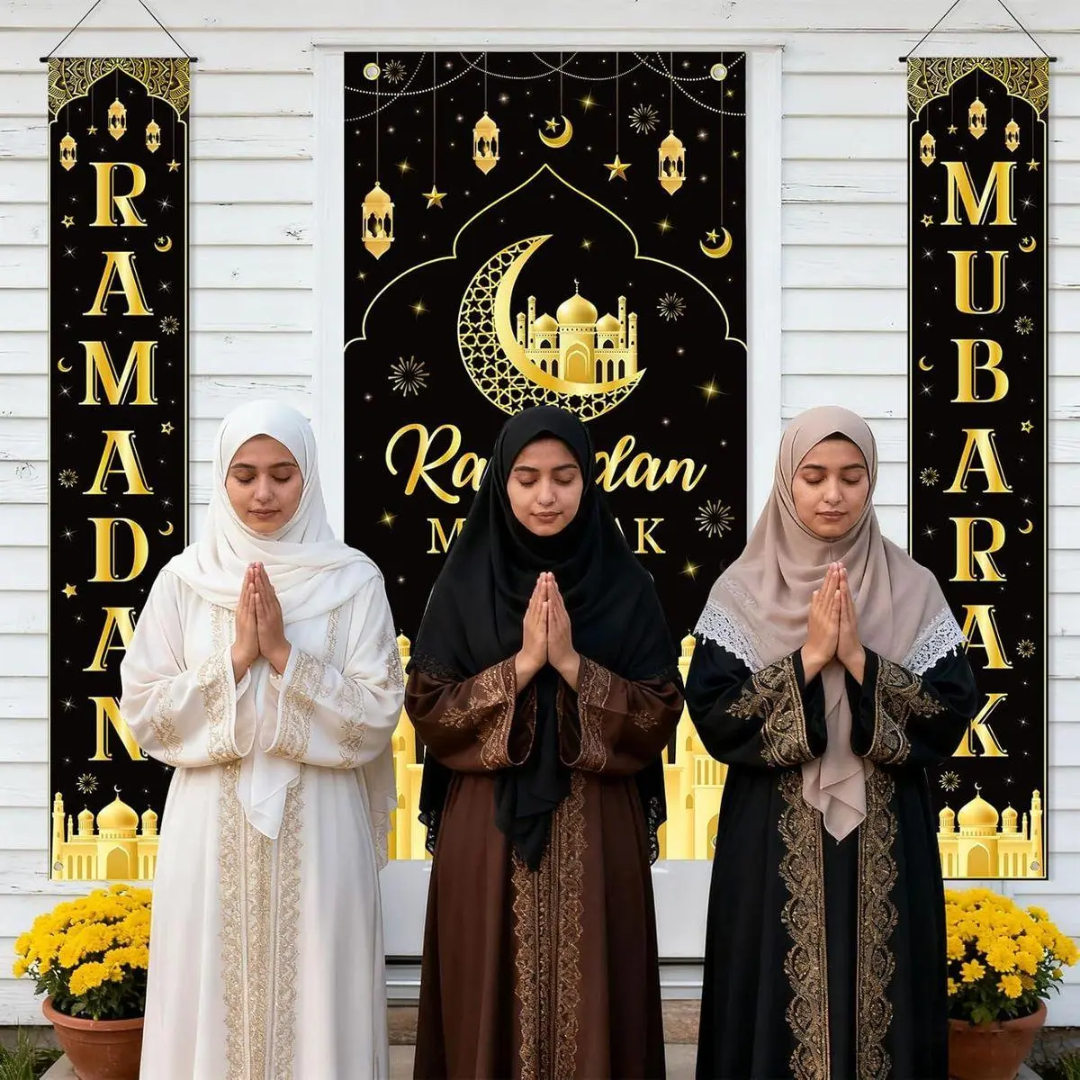 Ramadan Mubarak Decorations: There are 3 pieces of Ramadan Mubarak banner, contain 1 pcs black and gold door cover and 2 pcs Eid Mubarak hanging banner, offering you various Ramadan decor options. You can hang them together or separate the Ramadan door cover and Ramadan porch banner, creating a festive atmosphere for your Ramadan decorations for home