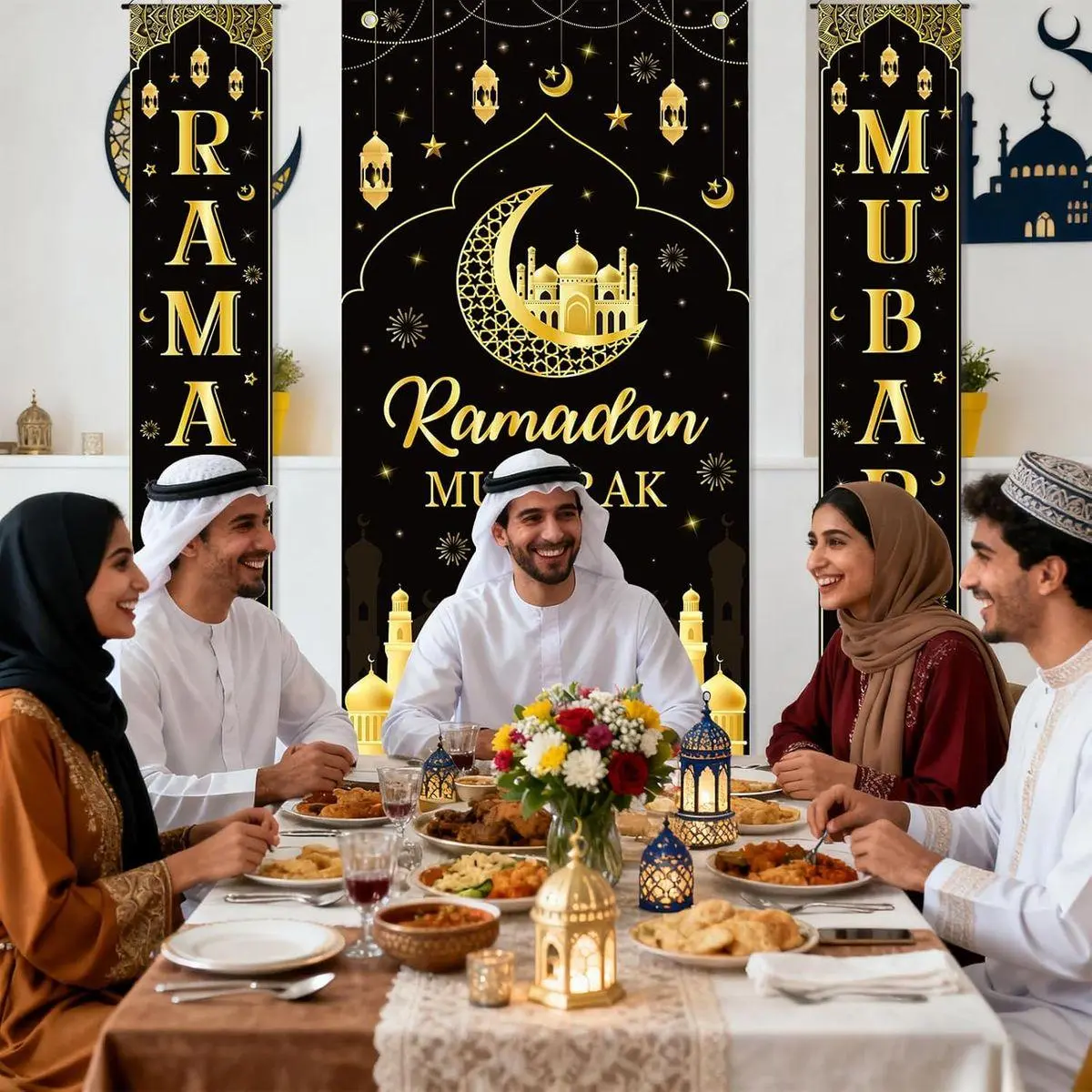 Unique Ramadan Themed Design: This Ramadan decorations outdoor set features black and gold moon lantern style, with a simple design and printed traditional Ramadan symbols such as crescent moons, stars, lanterns, starry sky, and mosques. Combined with the "RAMADAN MUBARAK" greeting, This Ramadan Mubarak sign showcases the festive culture and reflects deep respect and love for Ramadan culture