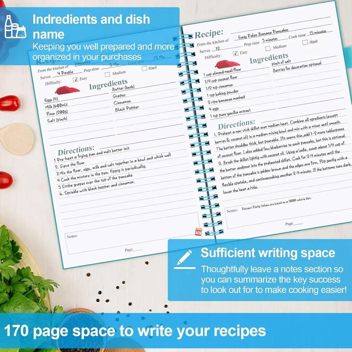 📘LOTS OF WRITING SPACE: Measuring 5.7x8.2", our recipe notebook boasts 170 pages necessary pages +2 pages ingredients list +9 pages content. Discover ample space on each page to document your recipes. From recipe name and prep time to difficulty and servings, our recipe journal provides dedicated sections for all the essential details. Unleash your culinary potential with the PECULA recipe book and infuse everyday cooking with excitement.