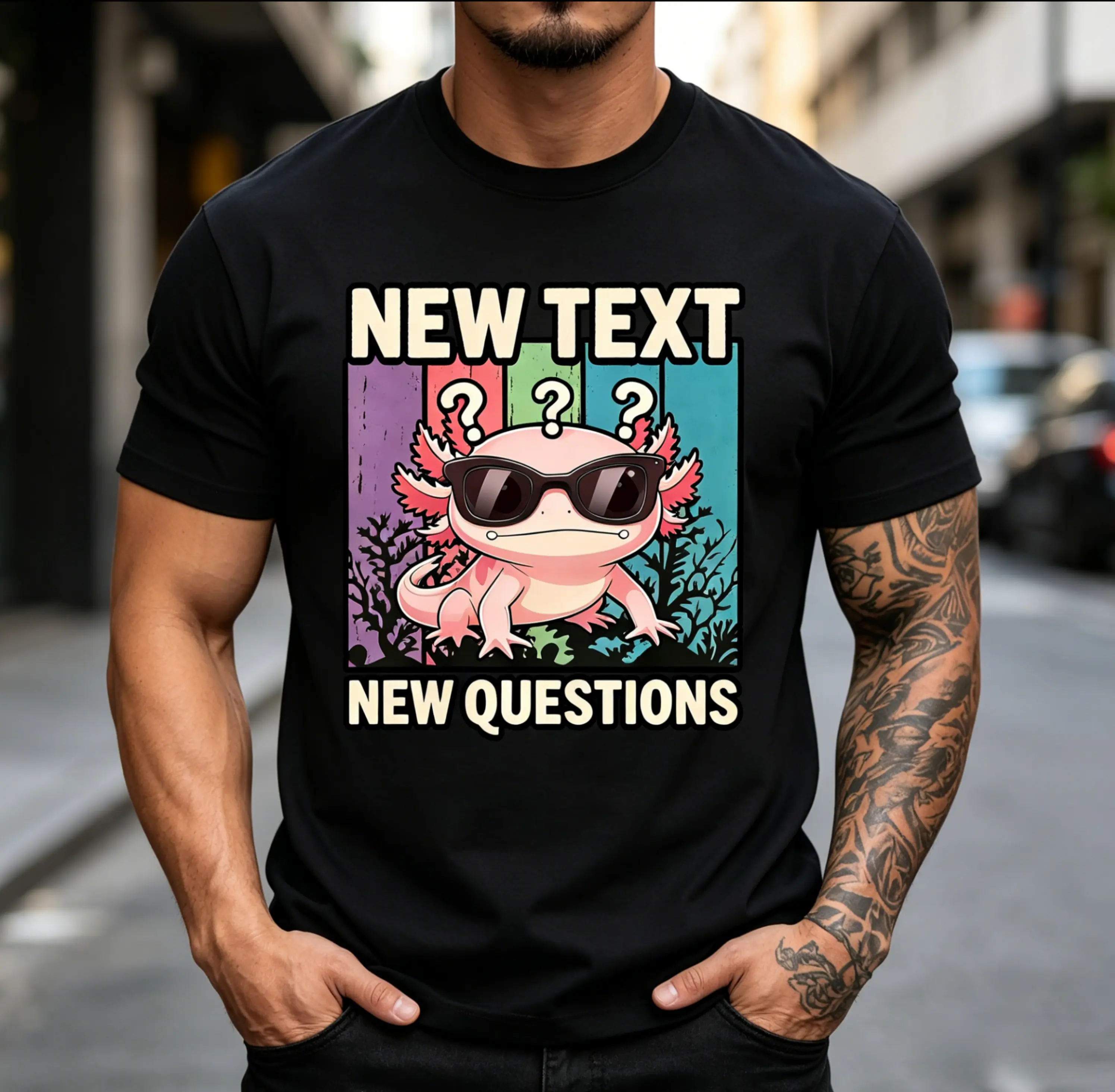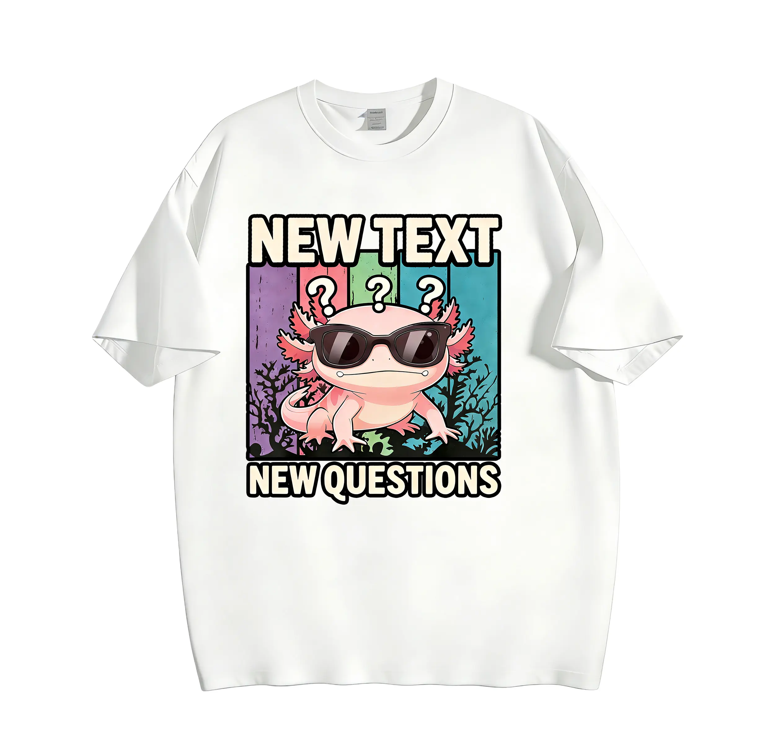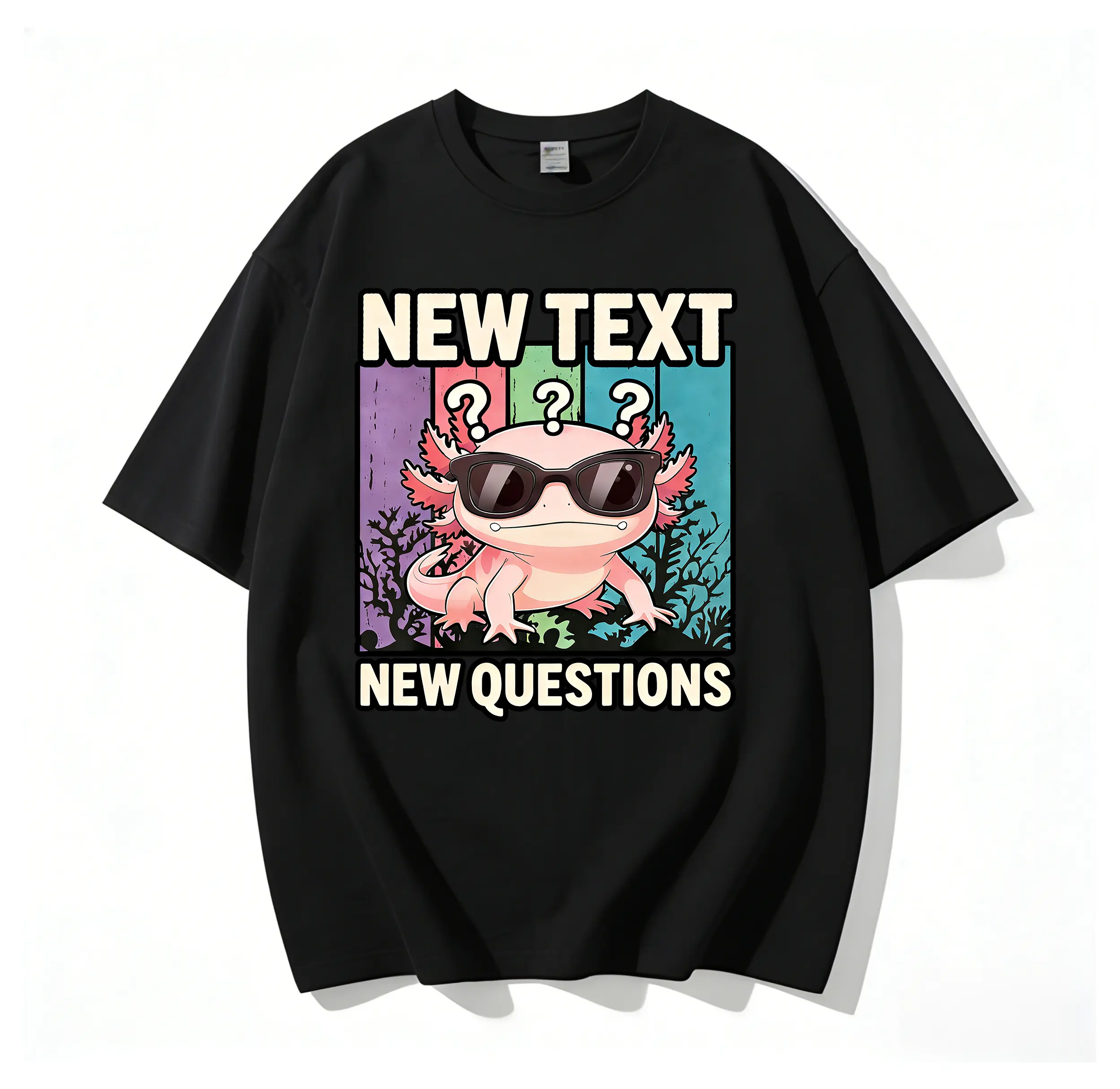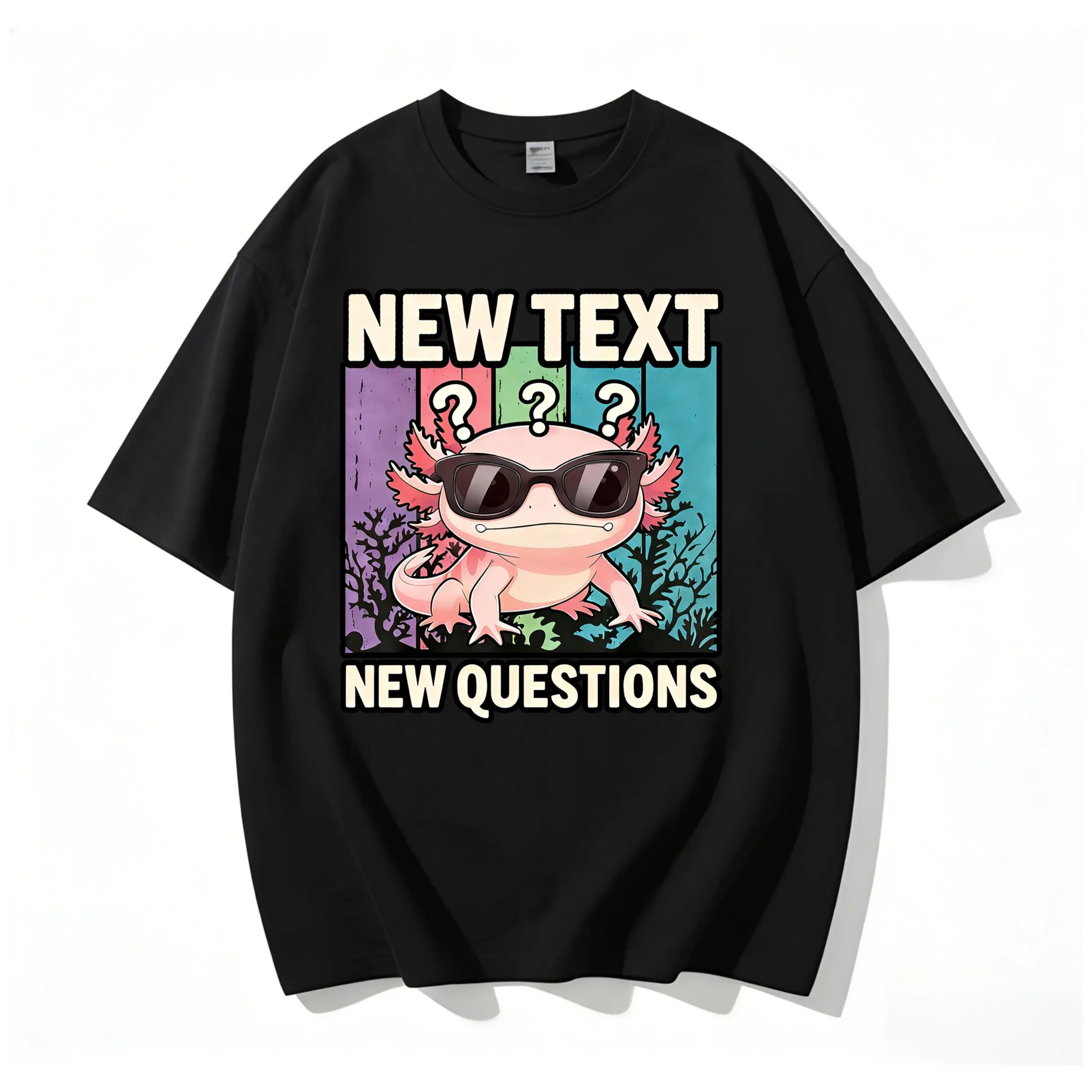 Our eye-catching front graphic features a cool, confident axolotl wearing sleek black sunglasses, with three raised question marks floating above his head — a playful, relatable visual that speaks directly to anyone who’s ever thought, “Wait, what’s going on?” or “I need some answers!” The bold, playful typography of NEW TEXT and NEW QUESTIONS frames the axolotl perfectly, creating a timeless, meme-worthy design that’s equal parts humorous, stylish, and full of personality.