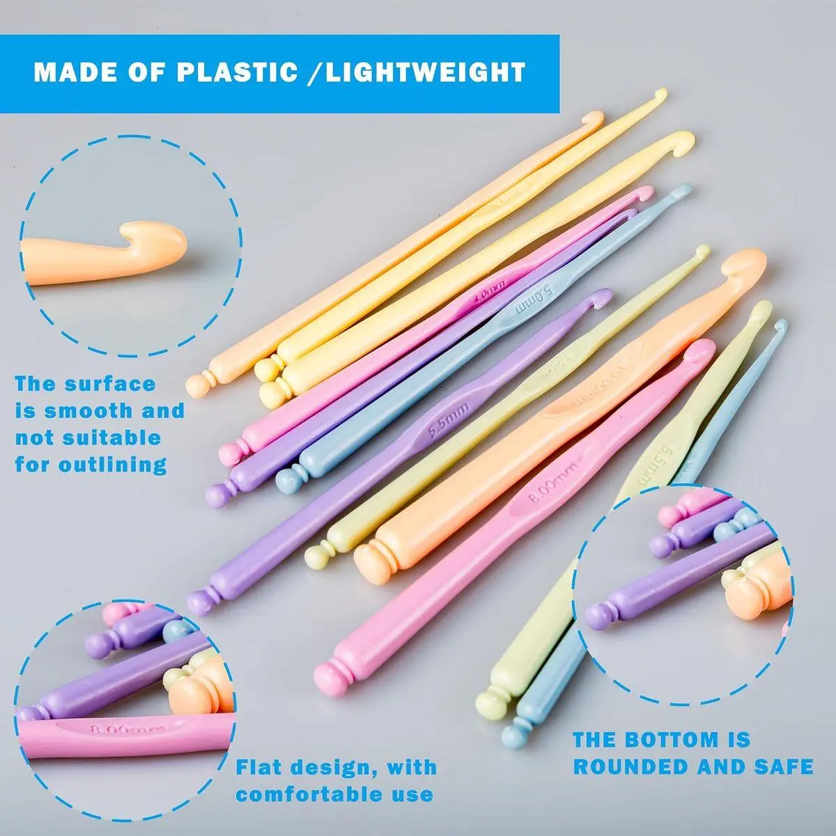 High-Quality, Smooth & Safe Material Crafted from high-grade plastic with a polished, rounded hook head. It glides through yarn without snagging or damaging your materials, offering a comfortable alternative to the cold feel of metal hooks. Durable and wear-resistant, these hooks are built to resist deformation and breakage, reliably accompanying you through countless creative projects.