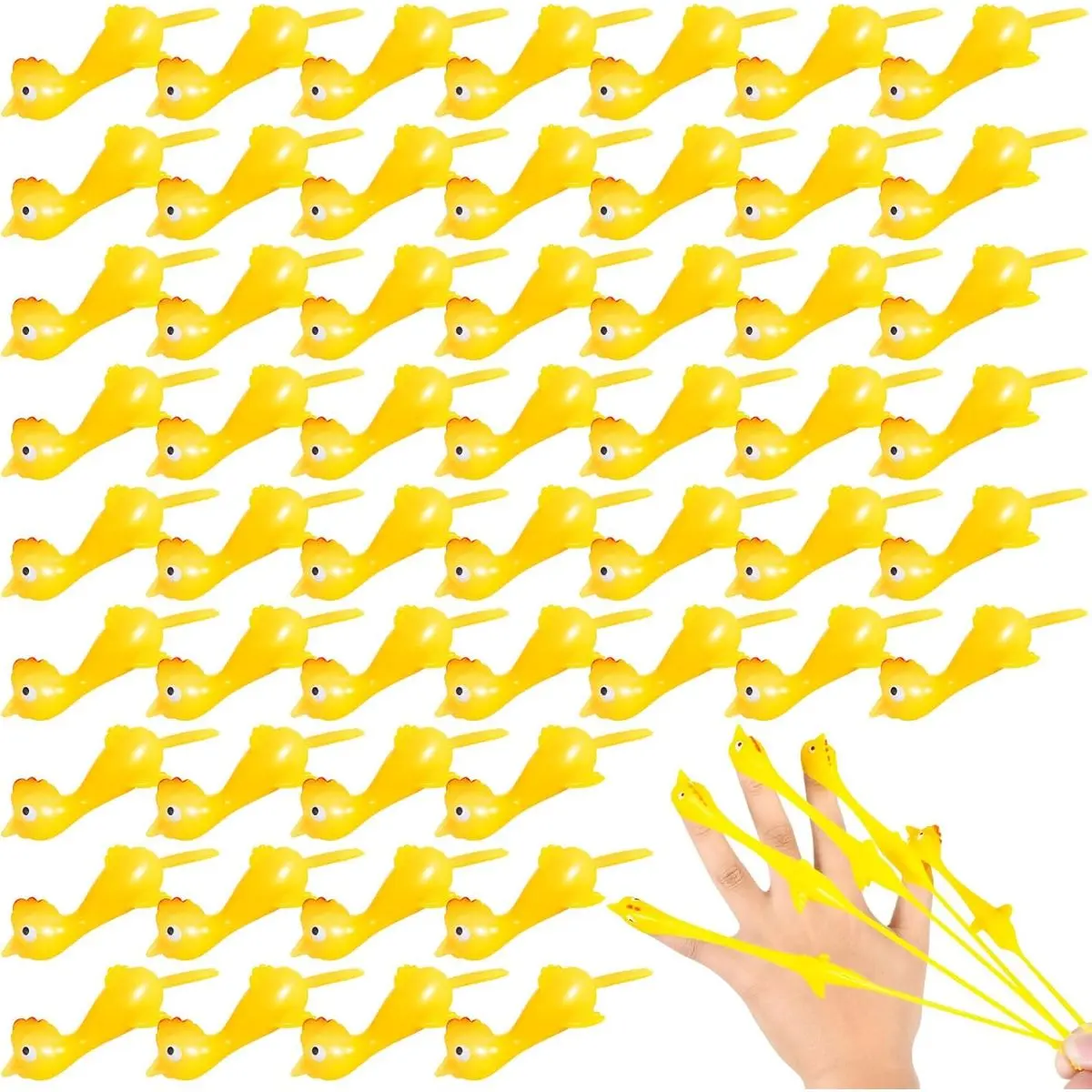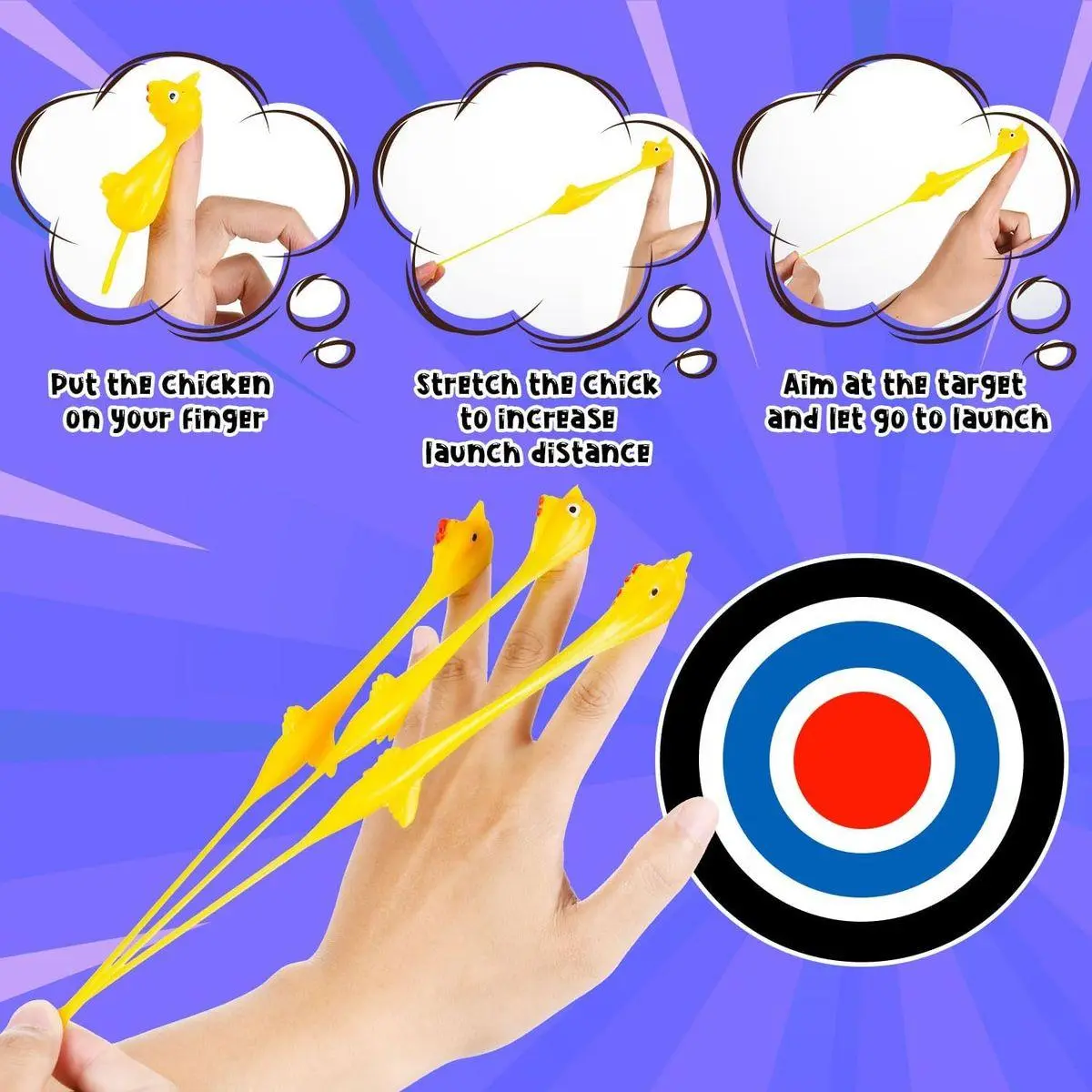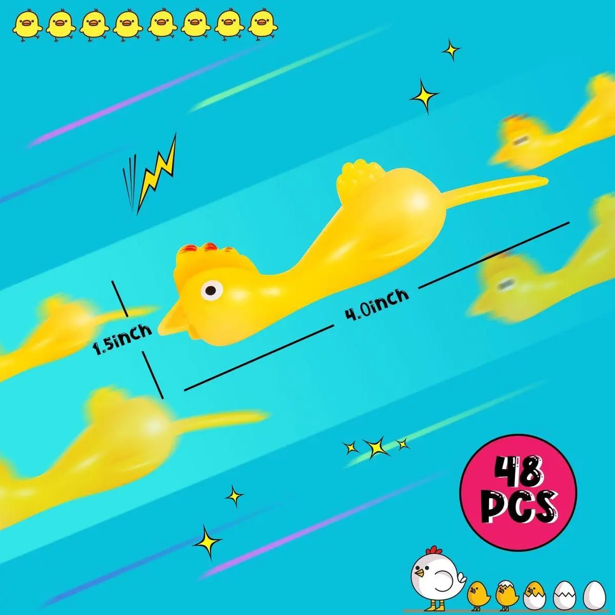 ENOUGH QUANTITY: You will receive 48 cute rubber chicken toys, which are enough to meet your gaming needs. Aim at the target and stretch to launch.
