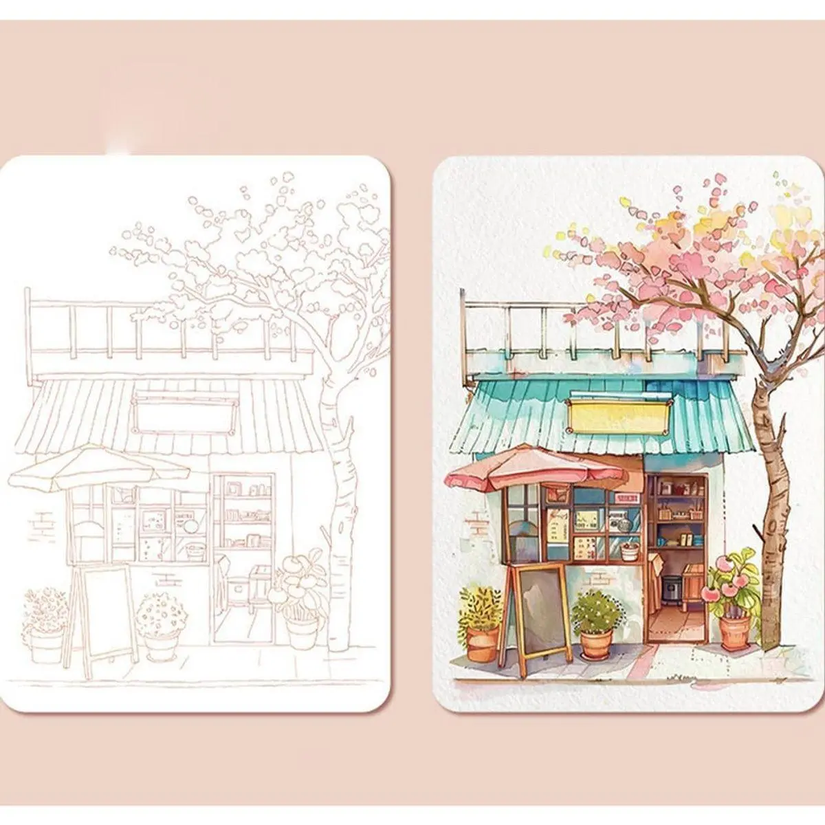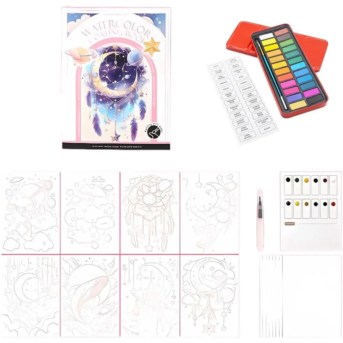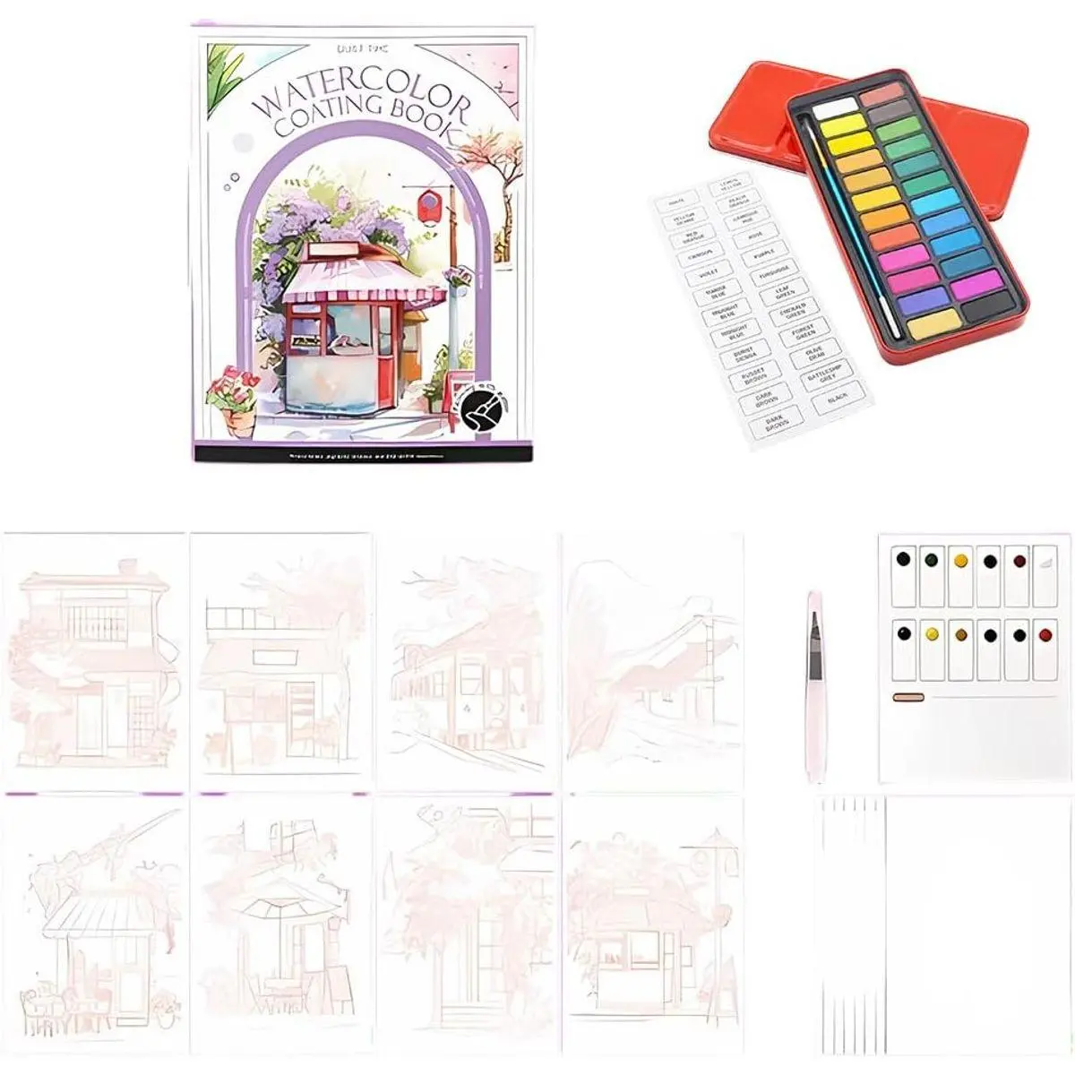Included Components: 24-color solid watercolor palette, water pen brush, three-fold watercolor notebook, pre-drawn line art sketches, blank sheets for freehand creativity, durable metal watercolor tin