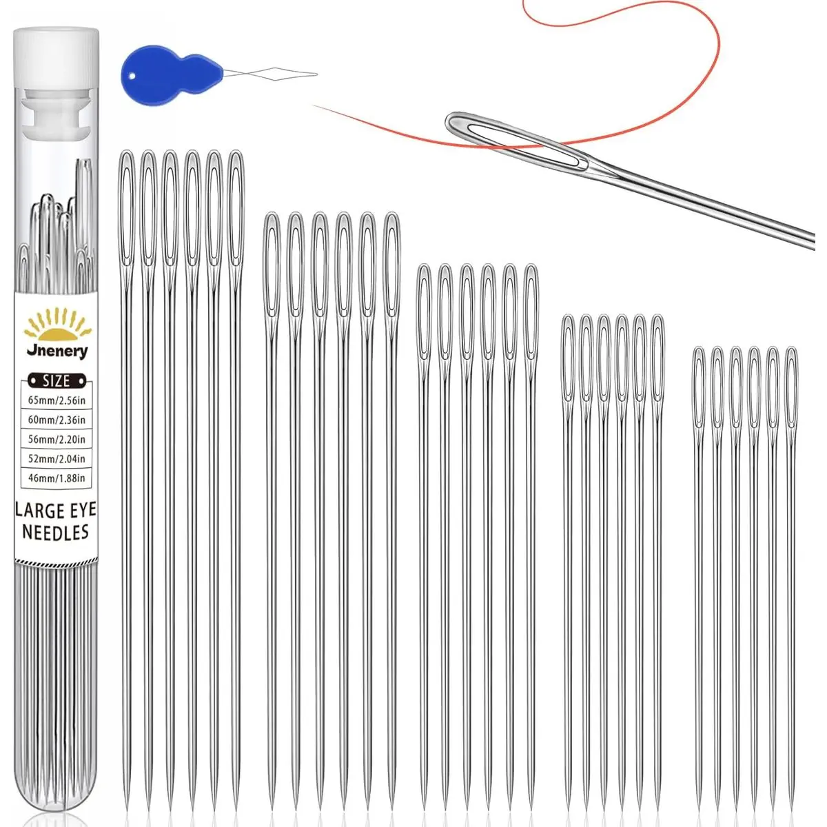 5 different sizes sewing needles set: The embroidery needles kit includes 30pcs big eye sewing needles (2.56in x 6, 2.36in x 6, 2.2in x 6, 2in x 6, 1.8in x 6) and a needles threader(randomly colors). Perfect sizes of yarn Knitting needles for you to finish your project