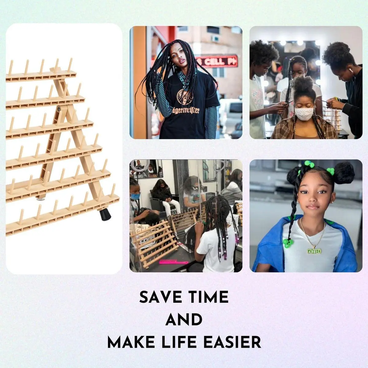 Braid Rack: Measures 15.75" x 13.3" x 3.9" with 60 spools for organizing hair.