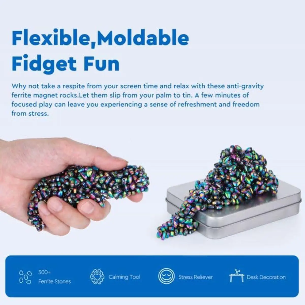 4. DURABLE AND LONG-LASTING:Made with robust ferrite stones, this putty withstands repeated use over time, maintaining its quality and providing continuous fidgeting satisfaction.