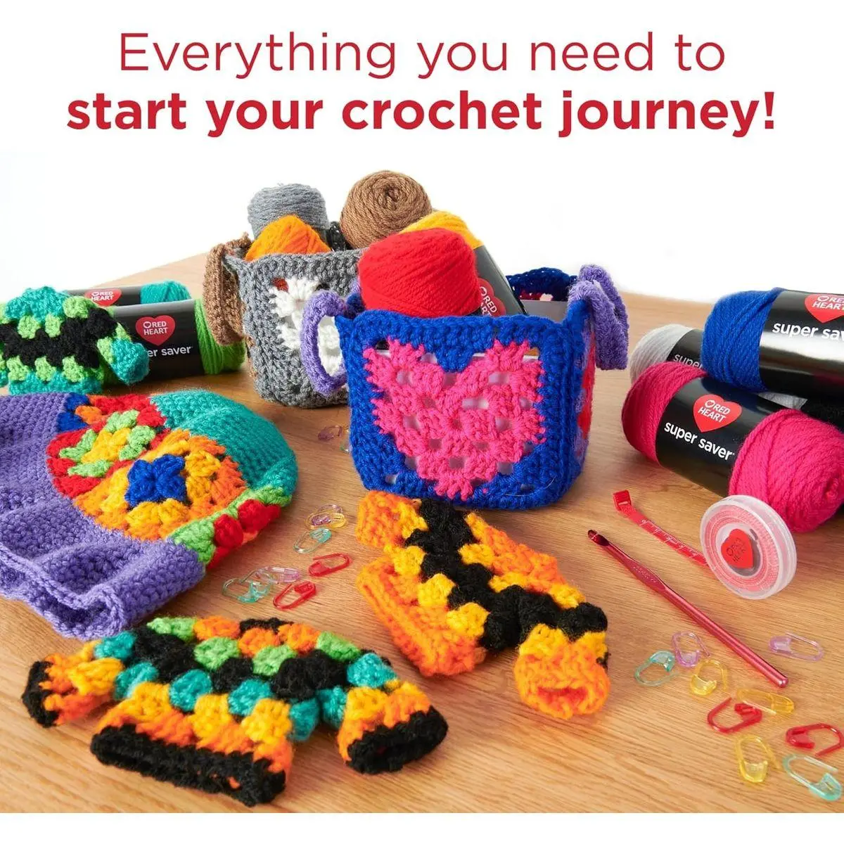 Complete Beginner's Crochet Kit: The RED HEART Super Saver Super Yarn Crochet Kit includes 12 balls of medium 4 worsted yarn, 1 Set of Susan Bates Crystalite Stitchpins (24 Plastic 0.75" Pins) ,1 Susan Bates Silvalume Crochet Hook U.S. (I/9 / 5.5MM)
