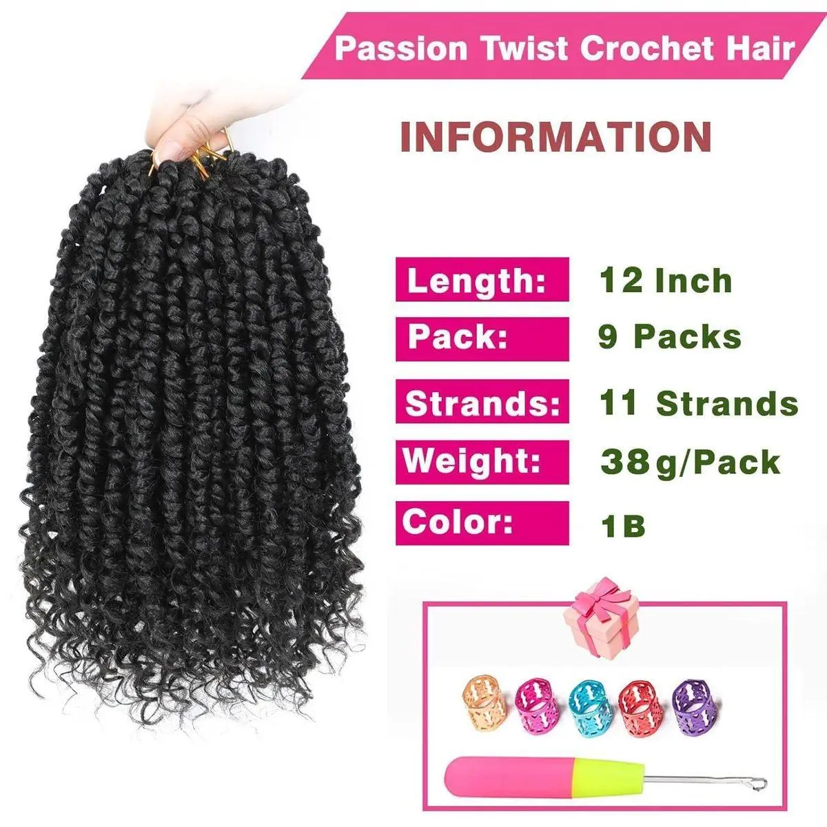 【Crochet Passion Twists Hair Package】You Will Get 9 packs of Pre-twisted Passion Twist Hair and 1 Crochet Hook, 5 Glam Rings, Please Let Us Know Without Hesitation, We Will Try Our Best To Solve Your Problem.