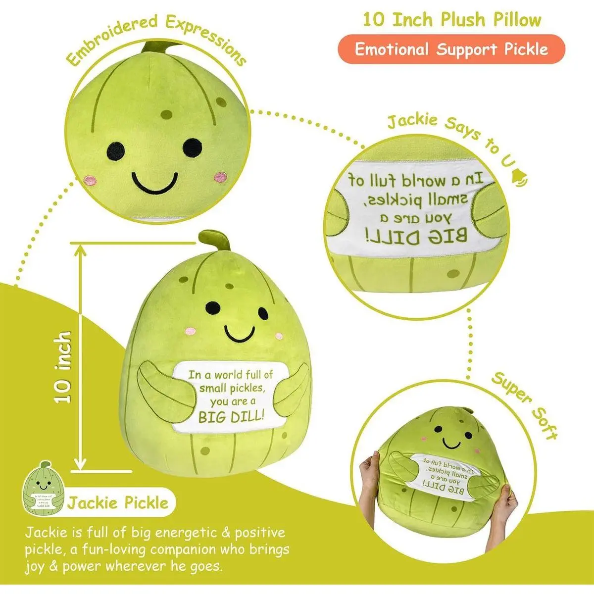 Adorable Design: This 10 inch emotional support pickle is perfect for cuddling & brings a big smile to you, your friends & coworkers with its adorable expression & vibrant green color.
