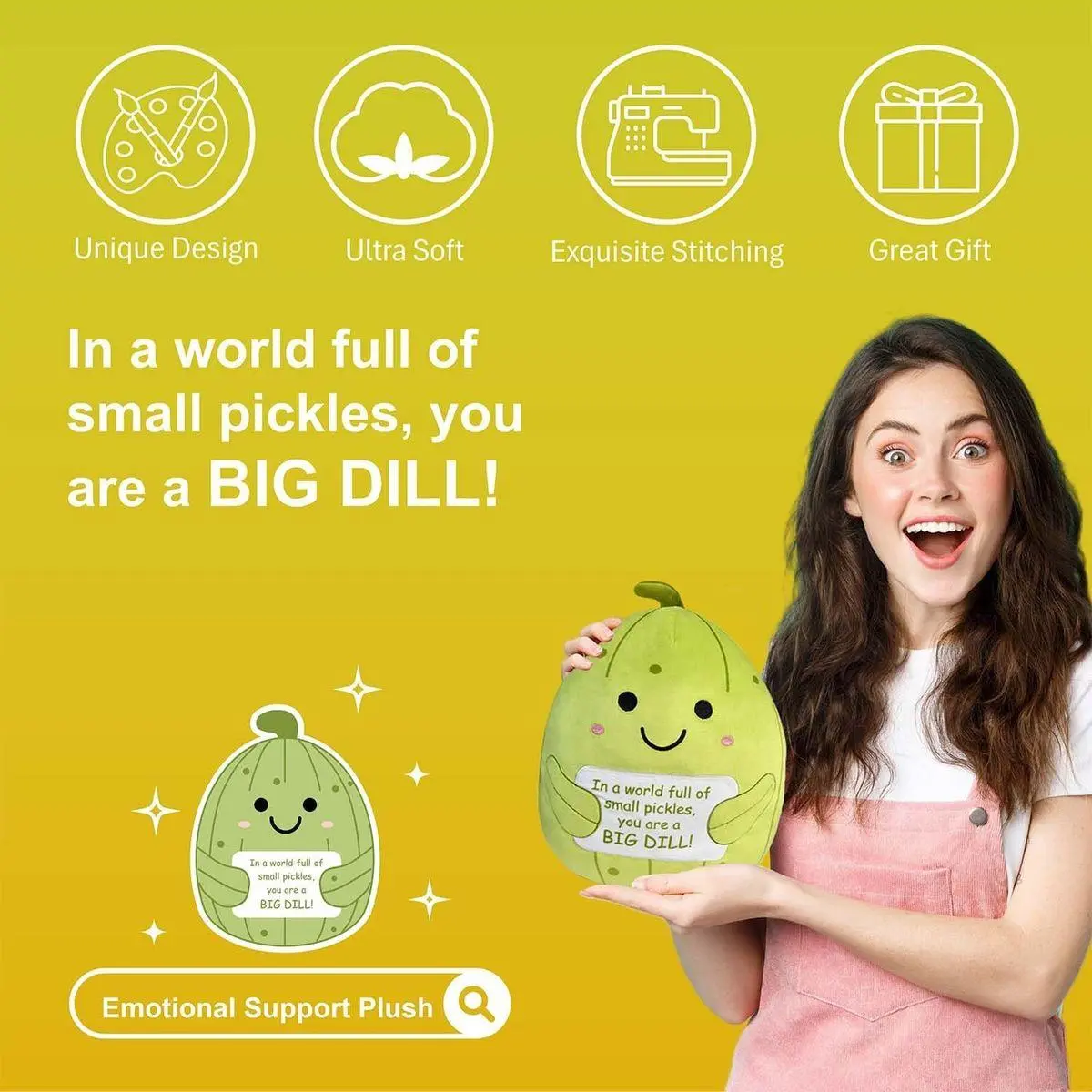 Emotional Support: This funny stuffed pickle holding an inspirational card is providing you comfort, encouragement & positivity. The world is full of nobodies, but you're a somebody!