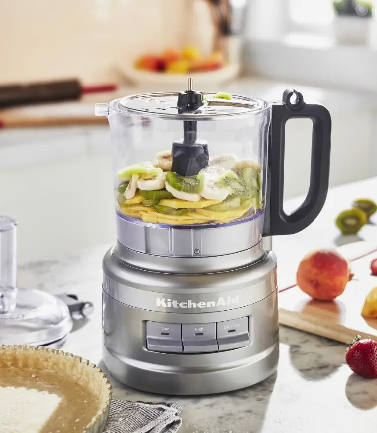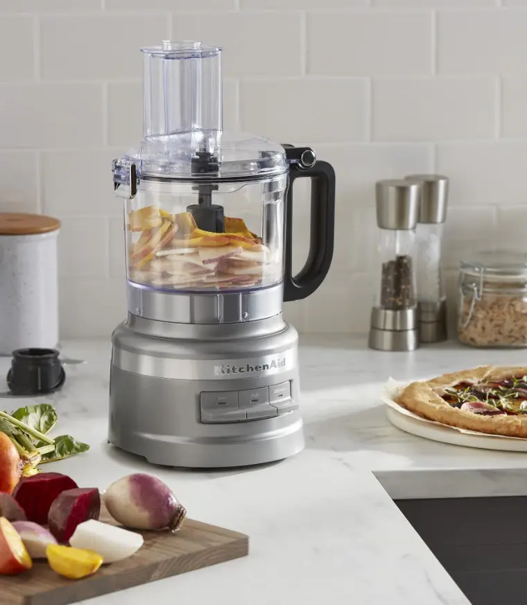 With its compact footprint and integrated accessory storage, the KitchenAid 7-Cup Food Processor simplifies food prep for everyday cooking while not taking up too much space in the kitchen. Chop, shred, slice and puree with three speed options, and make quick work of preparing fresh vegetables, making fresh salsa, rustling up quick soups and sauces and much more.