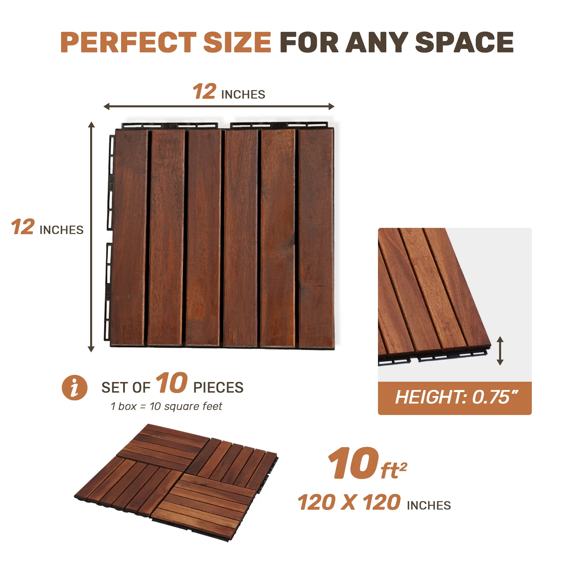 ✨ SAVEYOUR 10 PCS Interlocking Deck Tiles are designed for easy installation. Each tile measures 12" x 12" with a 0.75" thickness. The wood part is 0.47" thick, and the plastic part is 0.28" thick, ensuring drainage during rain. Ideal for patios, balconies, and pool sides, these tiles offer a practical solution for outdoor flooring.