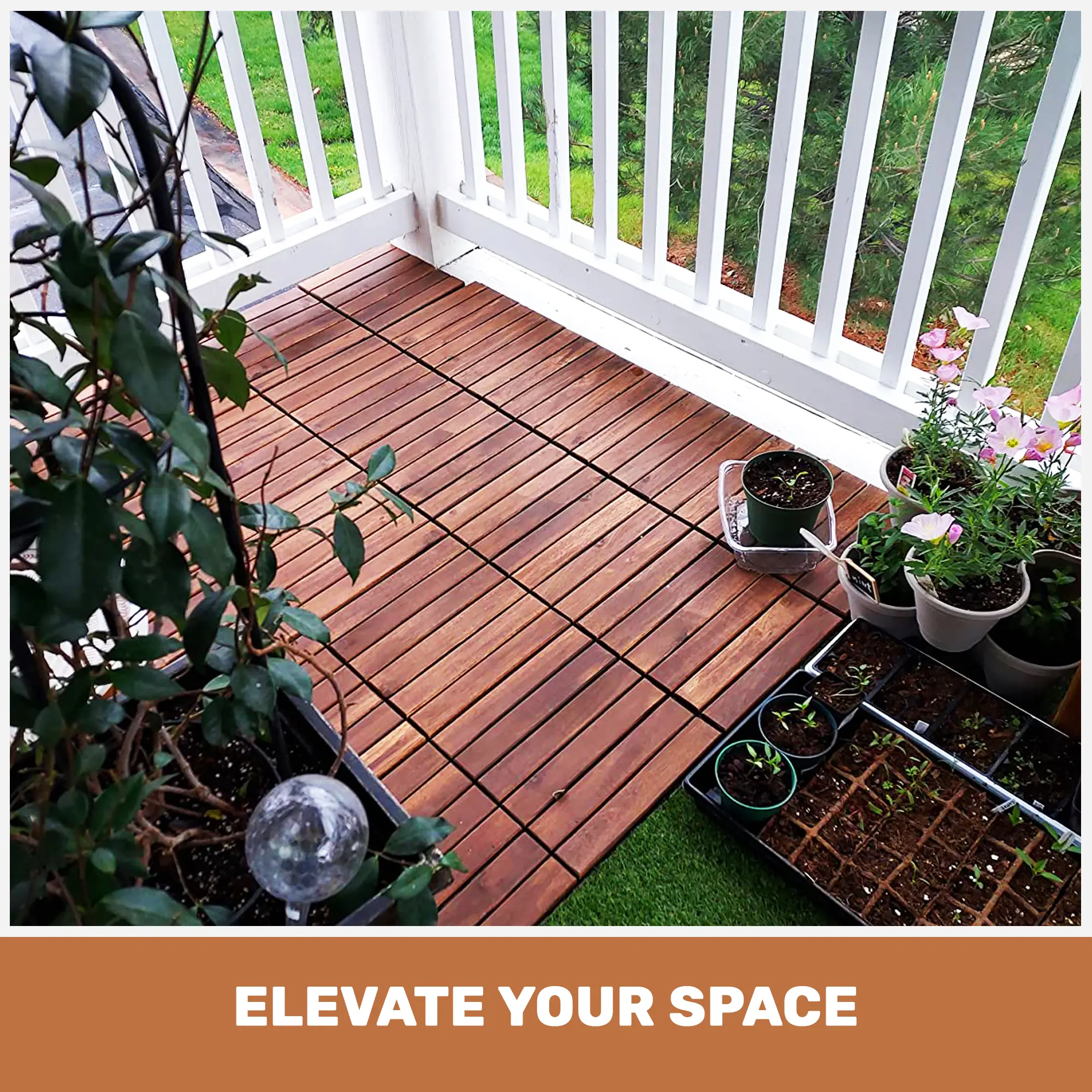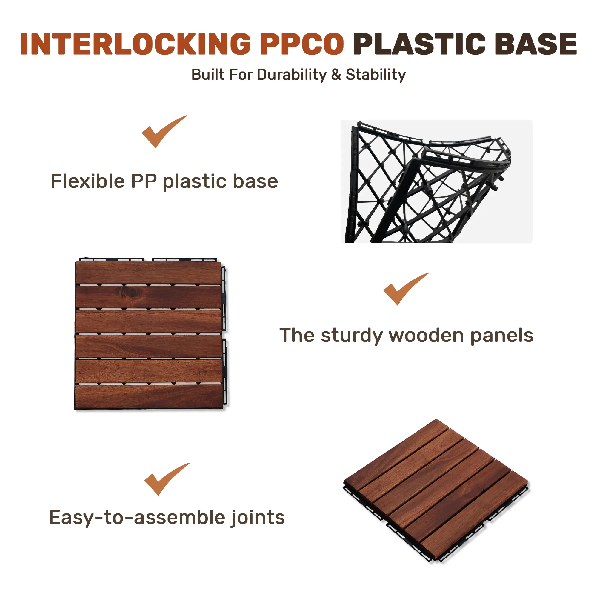 🏡 Suitable for gardens, swimming pools, balconies, and porches, these tiles are versatile. They are easy to assemble using a rubber hammer. The wood and plastic parts are attached with twisted plastic nail buttons, allowing for cutting to fit corner positions. A DIY-friendly product for your outdoor needs.