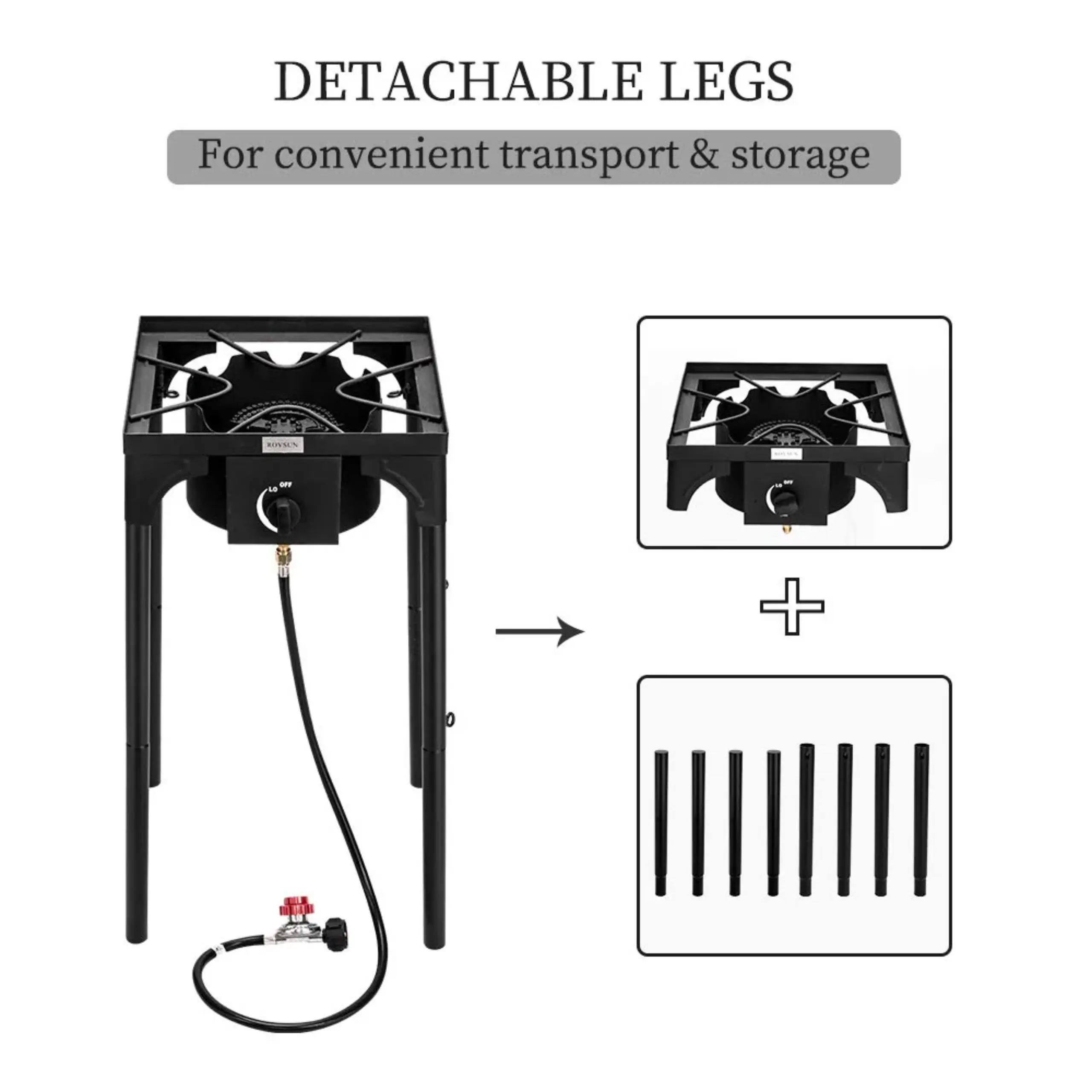 BrandROVSUNWeight15 lb.Width15.7 InchesDepth15.7 InchesHeight29.9 InchesColorBlackProduct Type1 BurnerMaterialCast IronOutput100,000 BTUHose47.2 InchesBurner Diamter10.24 InchesPropane TankNoLeather Tube IncludedYesCSA CertificationYes