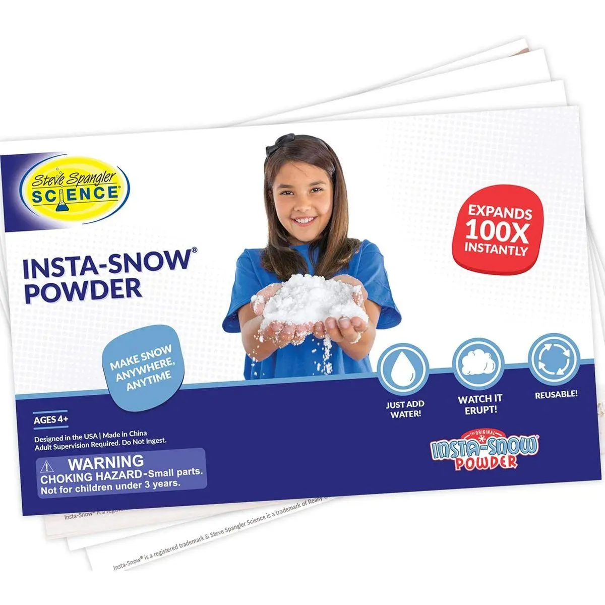 INCLUDED: This kid’s science kit includes 2.6 oz of Insta-Snow Powder, a plastic tank, and instruction cards with 4 experiments (From a Warm Liquid to a Very “Cool” Solid; The Handful-of-Magnificent-Snow Show; Dry Up and Drip On; Salt Polymer Destroyer).