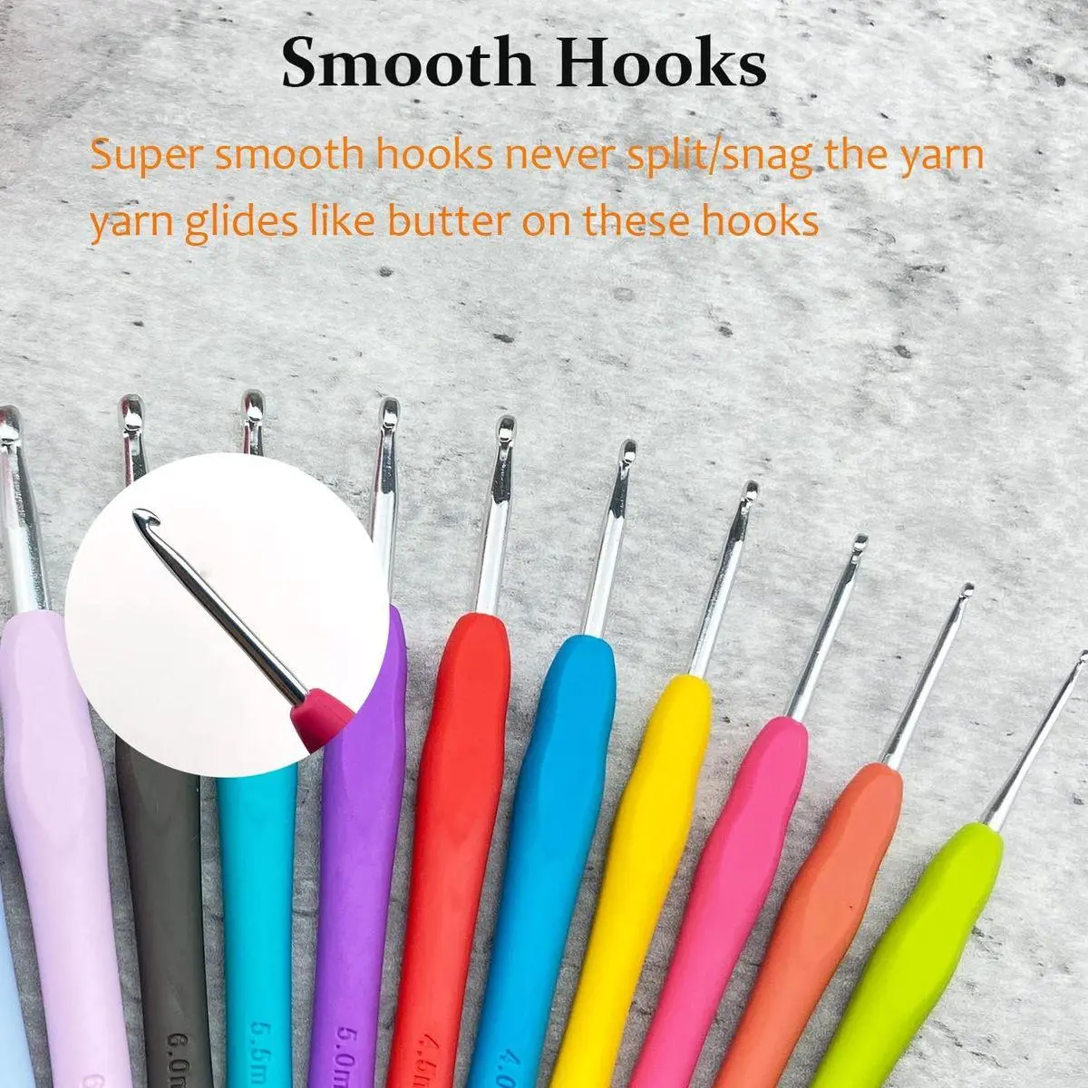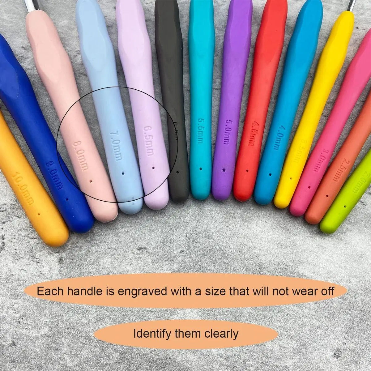 Each crochet handle is engraved with clear size,you can find more quickly the size you need.Our crochet hook is appr.5.5 inches length,You can choose a single crochet hook or crochet set from 16 sizes