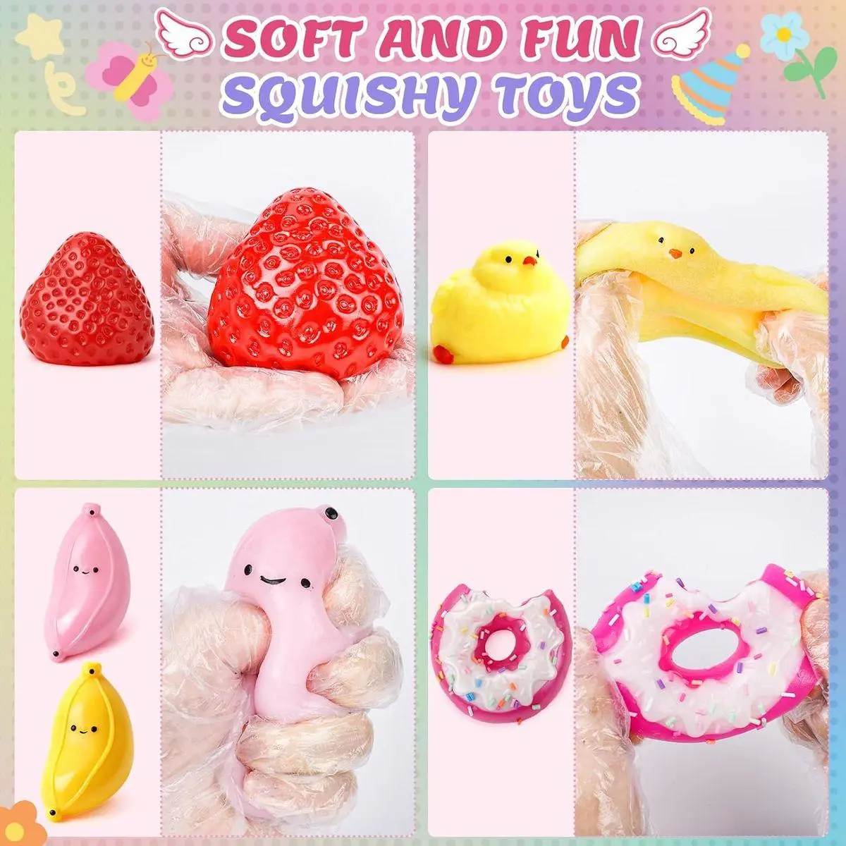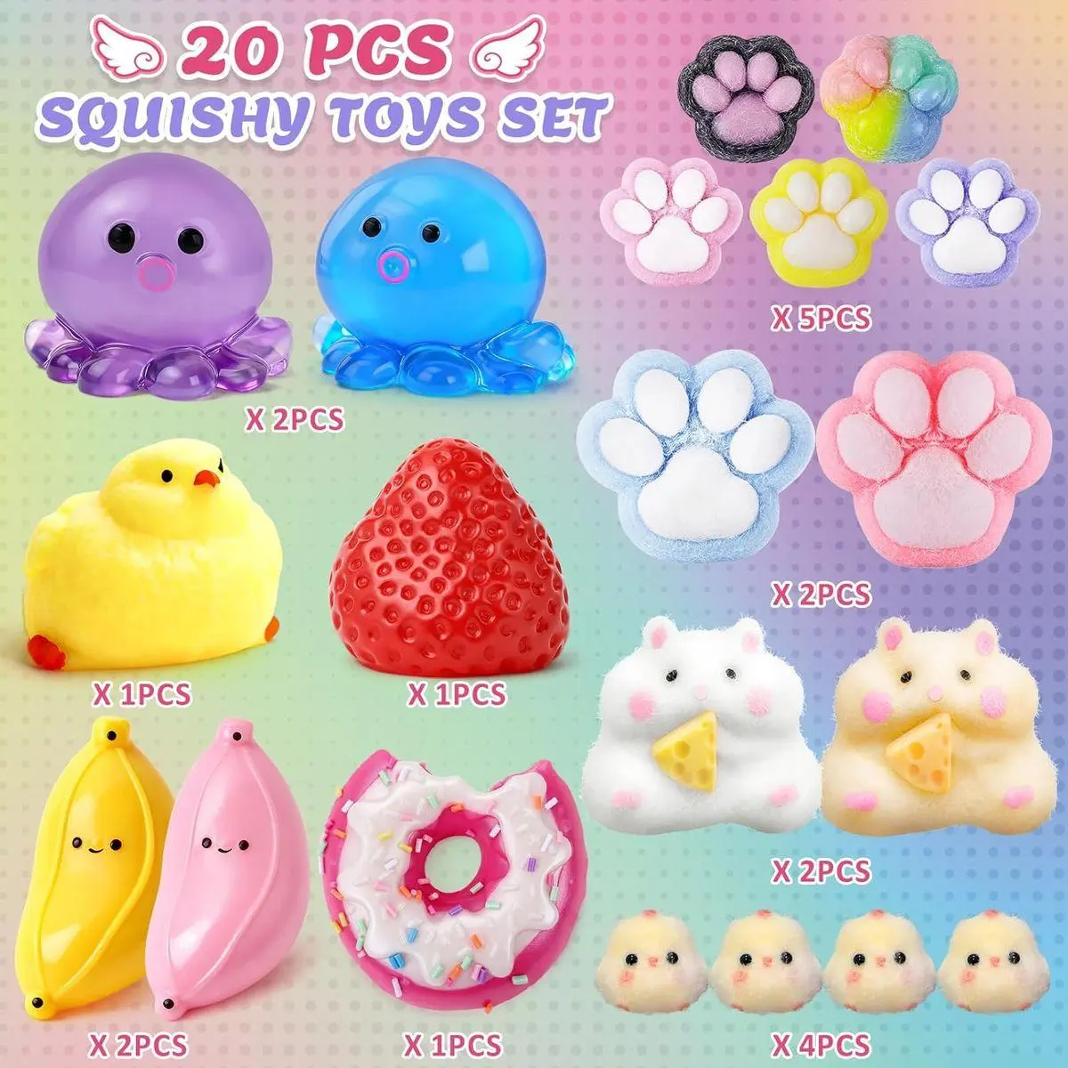 【PERFECT TABA SQUISHY PACK】This Taba Squishy toy set includes 20 fun toys: 1 Donuts Squishy +1 Big Chick Squishy + 4 Mini Chick Squishies + 2 Hamster Squishies + 2 Big Cute Cat Squishy + 1 Big Strawberry Squishy + 5 Mini Color Cat Paws Squishies + 2 Octopus Squishies +2 banana Squishies. Almost covering all popular styles, bringing them home at a more cost-effective price in one go.