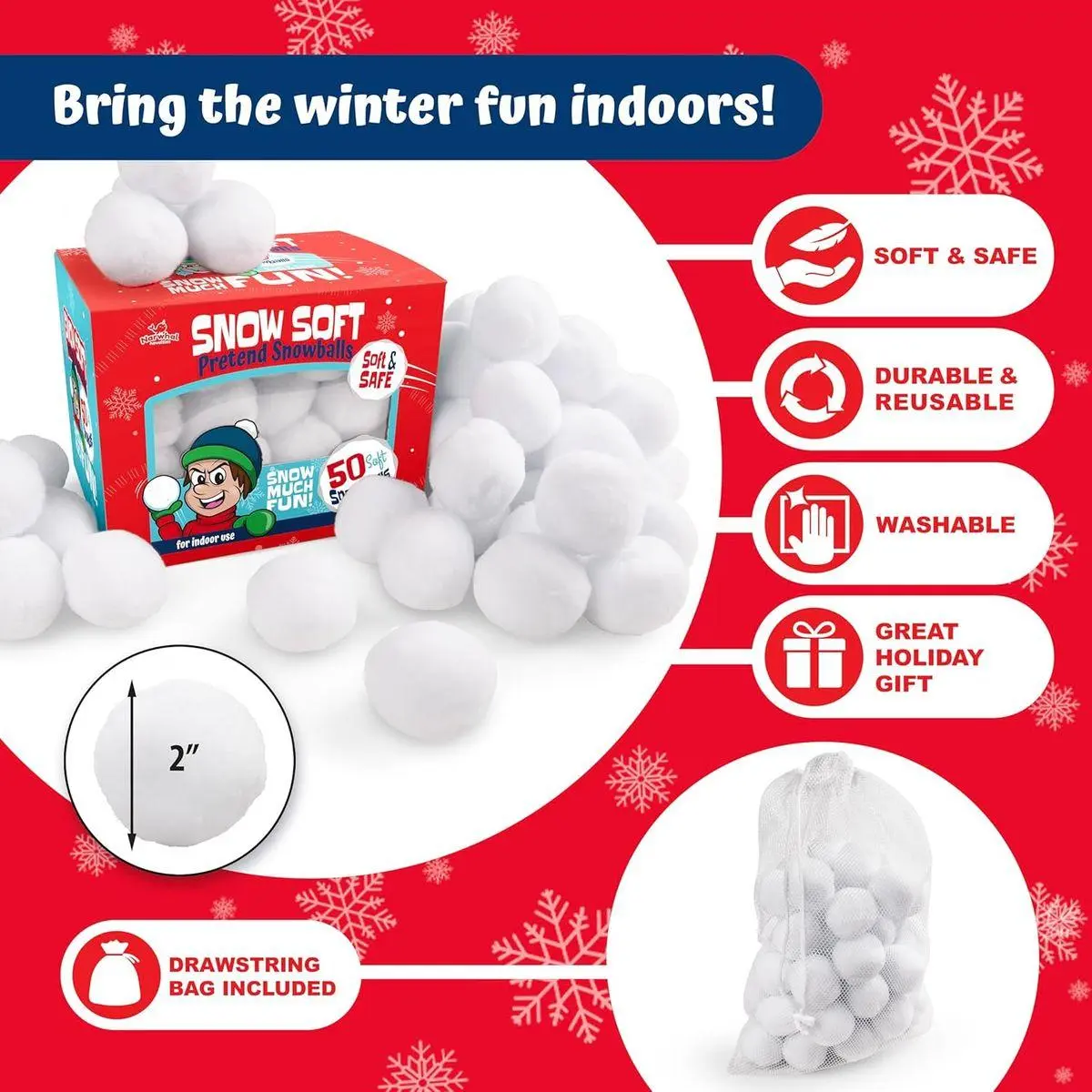 Package Includes 50 Pack of 2 Inches Soft White Balls, Snowballs Packed in a Gift Ready Box with a Drawstring Bag Making it a Perfect Gifting Option for Holidays, Birthdays or Winter Parties