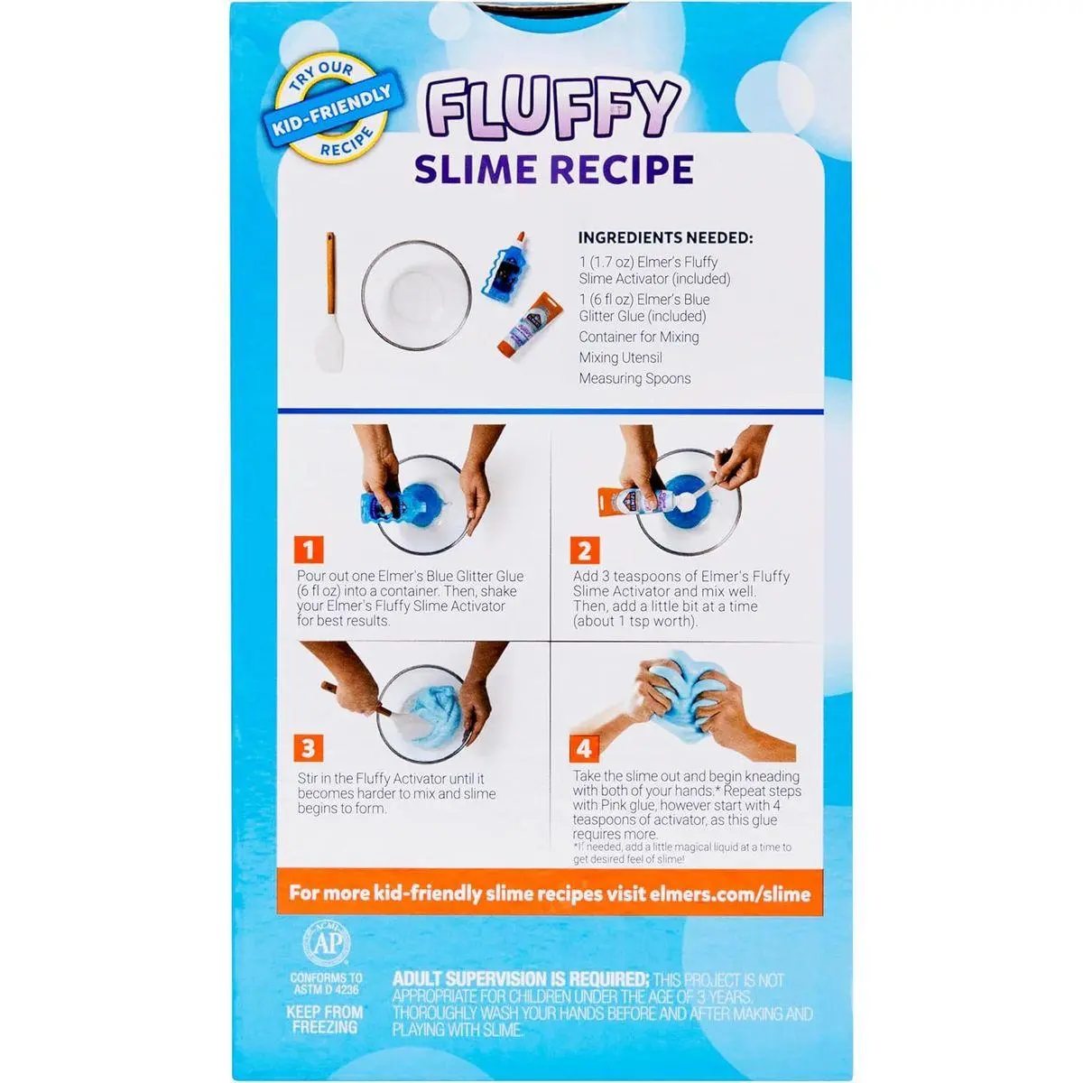 Kit includes: 2 tubes of Elmer's Fluffy Slime Activator (1.7 fl. oz. each); 1 bottle of Pink Translucent Color Glue (5 fl. oz.), 1 bottle of Blue Glitter Glue (6 fl. oz.)