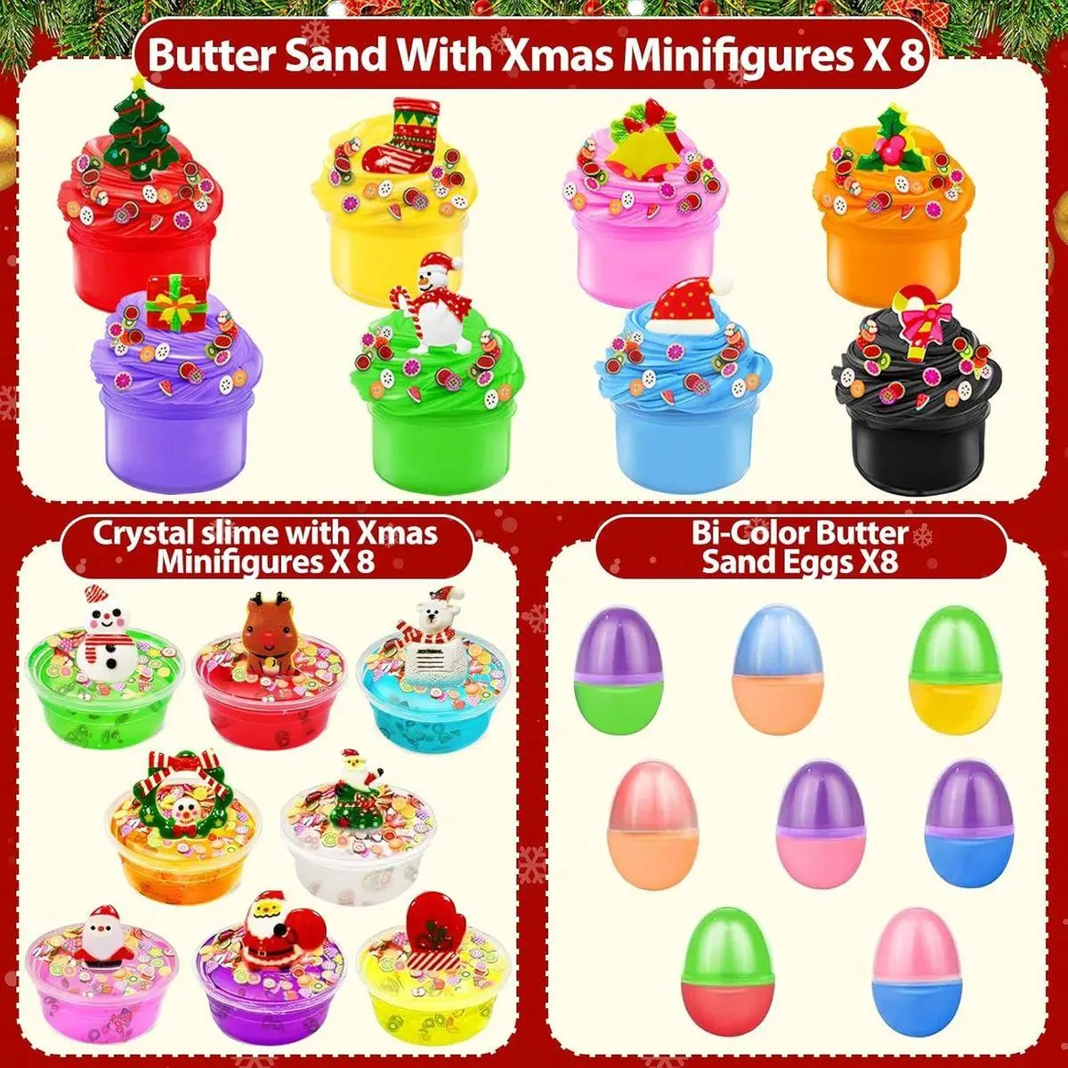 Christmas 24 Days Countdown Calendar: Christmas slime advent calendar is divided into 24 windows corresponded with 24 days of Dec. 24 Toys hidden behind each window for kids to open everyday, 3 Types slime, includes 8 dual colored slime eggs, 8 slime and 8 butter slime with various of accessories