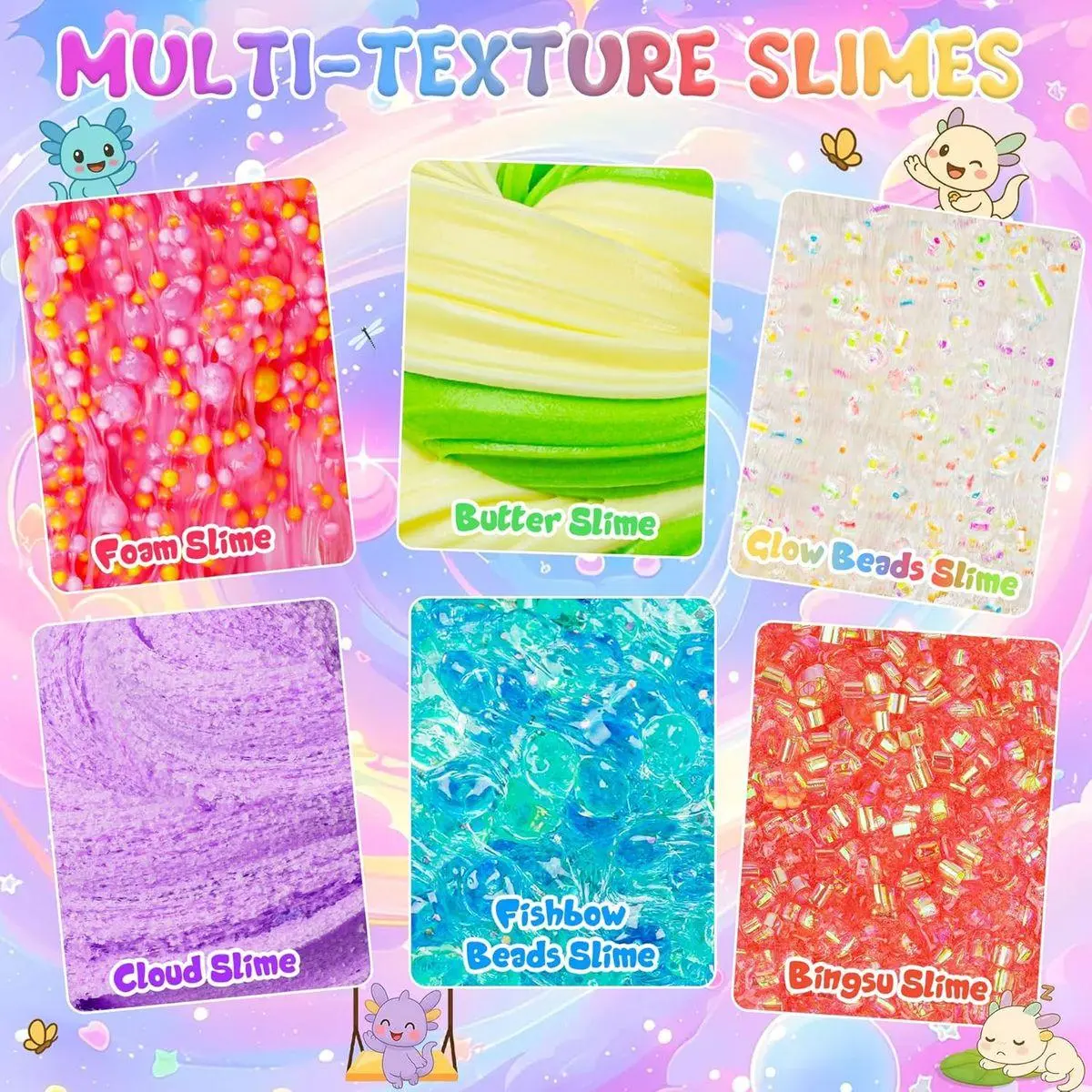 😀 6 Unique Textures in 1 Pack: Explore 6 different slimes (100ml each) with fun textures like fluffy, crunchy, and glow-in-thedark! Each slime offers a unique sensory experience for endless ASMR satisfaction