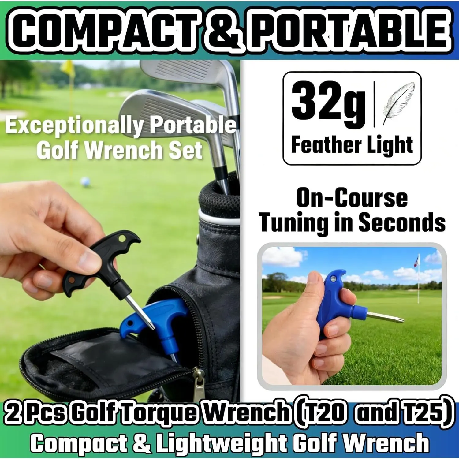 [Dual-Wrench Precision Set]:This 2-piece golf torque wrench set includes both T20 (black) and T25 (blue) wrenches, designed for exact adjustments of golf club weights and adapter sleeves.Made from S2 tool steel with reinforced plastic, each golf wrench features a 6*7mm working head and 75mm Ideal as a golf wrench[Multi-Brand Compatibility]:This golf wrench set is compatible with most major drivers.The included T20 and T25 bits fully cover weight adjustment and shaft adapter needs.Its solid, one-piece construction offers direct feedback for precise, feel-based adjustments.Ideal for both professional fitting and regular maintenance, it's a durable and portable tool for on-course tuning and consistent performance.[Engineered for Durability]:Constructed from high-quality stainless steel and impact-resistant plastic, these golf club wrenches resist rust, wear, and corrosion.The S2 tool steel core ensures maximum torque resistance, while the 32g lightweight build maintains strength-perfect for frequent use as a driver adjustment tool on the course or in the workshop.[Ergonomic, Fatigue-Free Grip]:The textured, non-slip handle minimizes hand strain during prolonged use.Its ergonomic shape (3.15" x 2.76" x 0.52") fits comfortably in hand, enhancing control when tightening/loosening T20 and T25 torque screws with this golf adjustment tool on driver heads or adapter sleeves.[Exceptionally Portable & Golf Bag Essential]: Exceptionally lightweight at just 32g, this compact tool tucks effortlessly into pockets, golf bag compartments, or anywhere else you need it. Its small size ensures it's always within easy reach on the course or during travel, making it an indispensable accessory for any golfer who wants to fine-tune their equipment on the go.