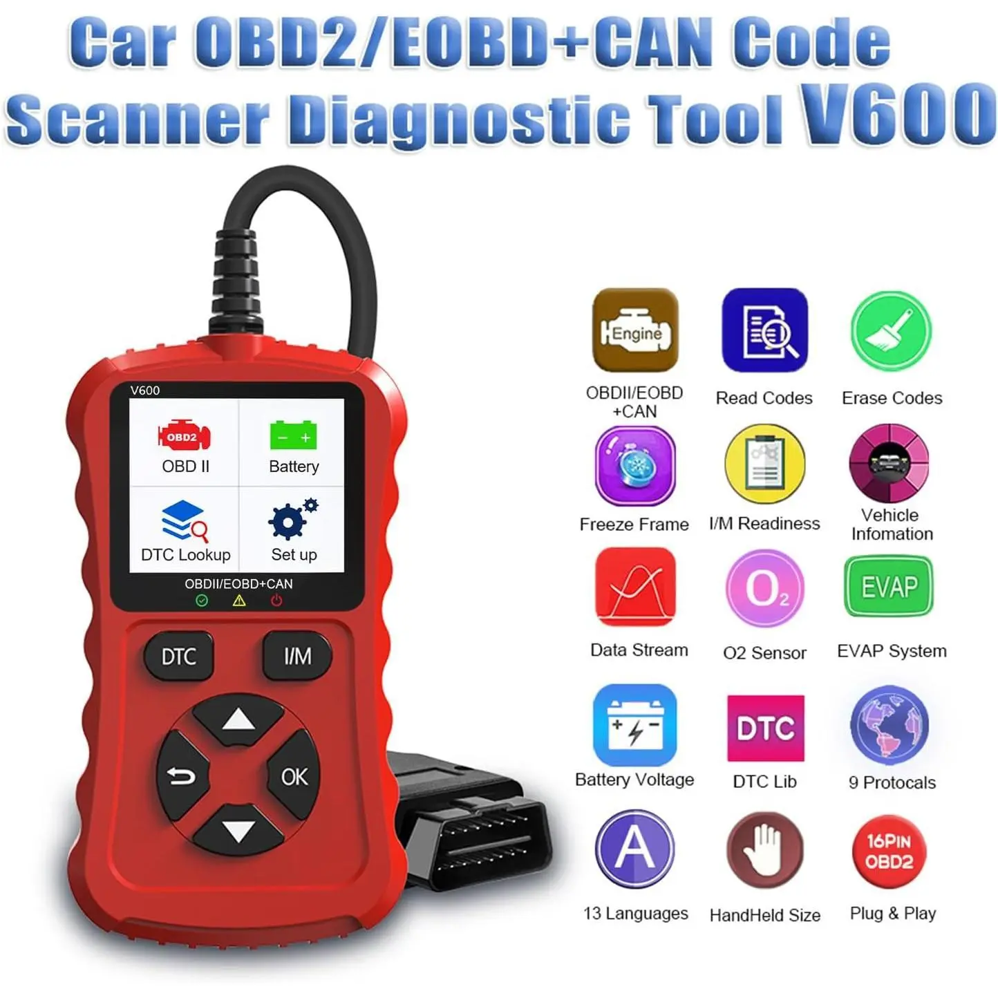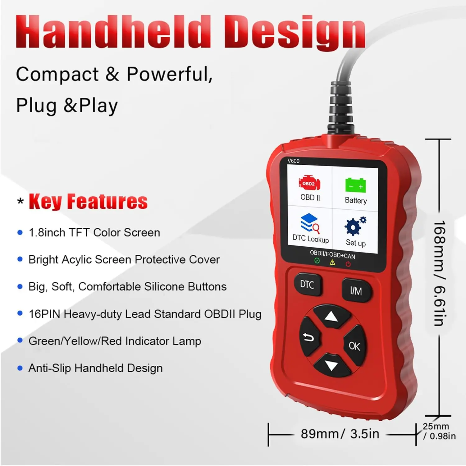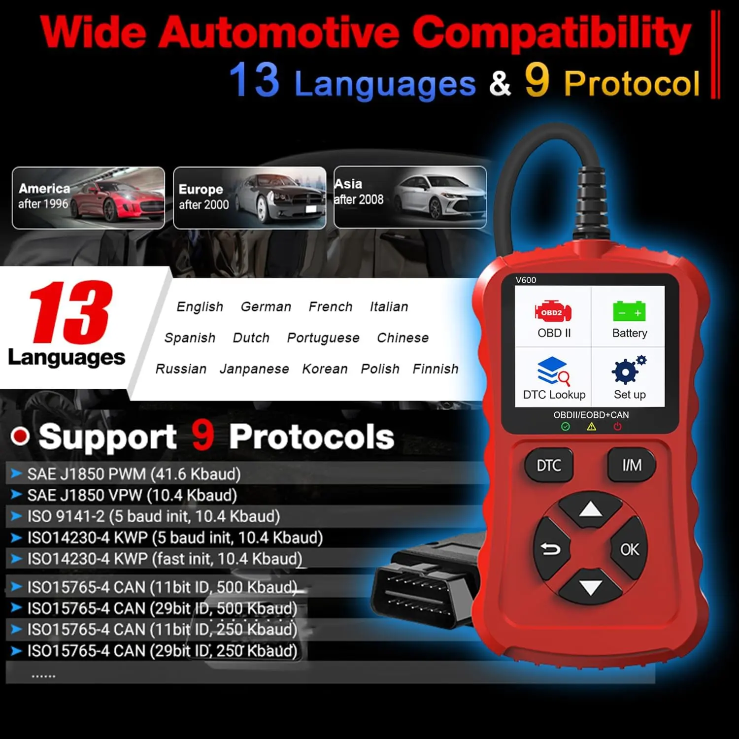 OBD2 Scanner is a powerful diagnostic tool for most OBDII vehicles (after 1996). With over 36,000 fault codes, it can read and clear engine codes, supporting live data, freeze frame and I/M readiness check. Voltage test monitors the electrical system, while advanced chips provide faster and more precise results. Made of impact-resistant material, V600 CAN diagnostic scan tool features non-slip design, bright screen and plug-and-play convenience. Meanwhile, this car code reader is compatible with over 1,000 car models, 13 languages, and comes with a 90-day warranty and 24/7 support, making it perfect for both home and professional use.