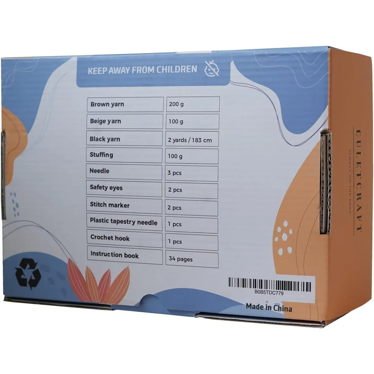 Included Components: Brown yarn, Beige yarn, Black yarn, Stuffing, Needles, Safety eyes, Stitch marker, Plastic tapestry needle, Crochet hook and Instruction book