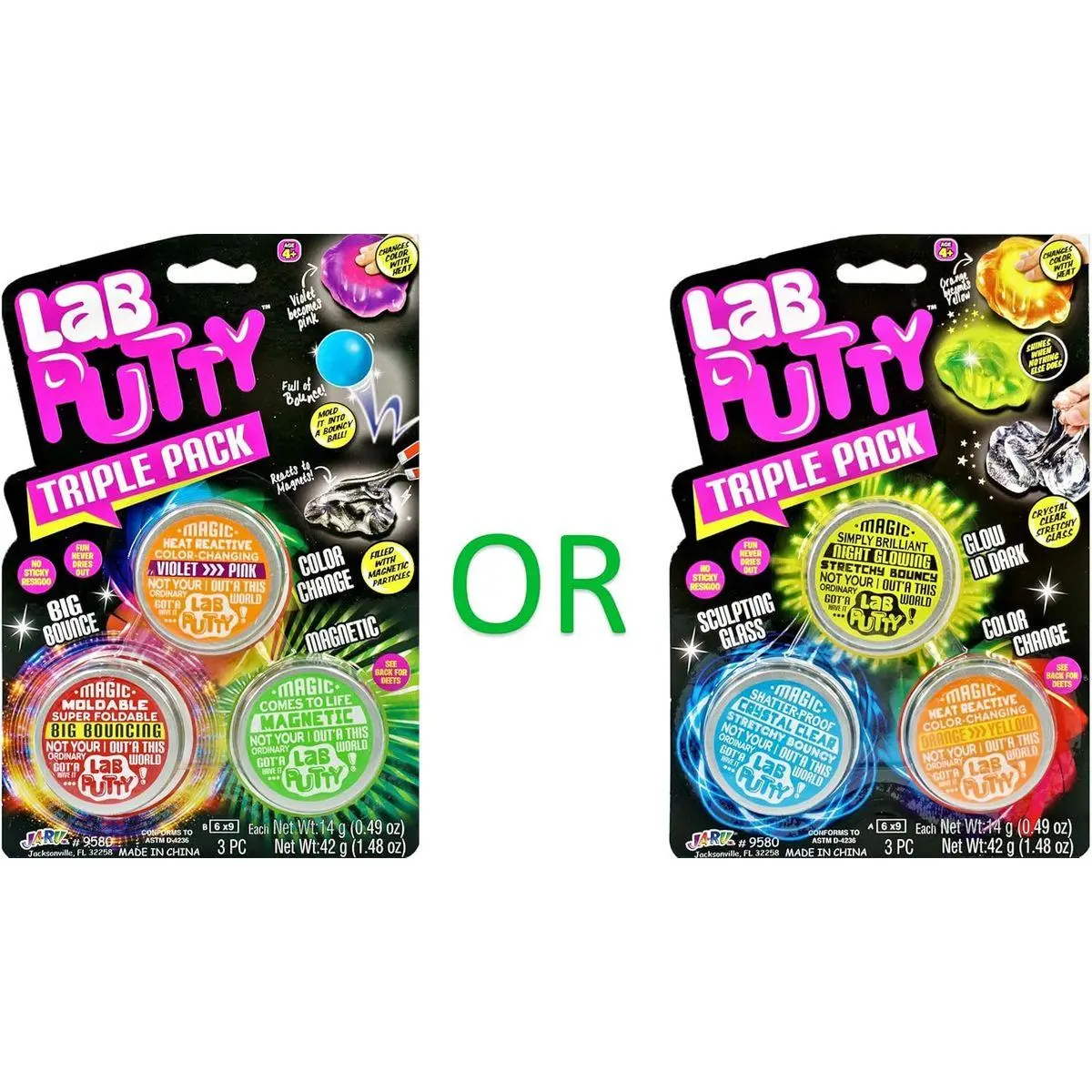 1 Bundle Pack of Lab Putty - Each Set includes 3 Assorted Putty (Glow in the Dark Slime for Kids, Clear Slime, Bouncy Putty, Color Changing Lab Putty, Magnetic Putty for Kids) Comes with metallic tin containers for each putty.