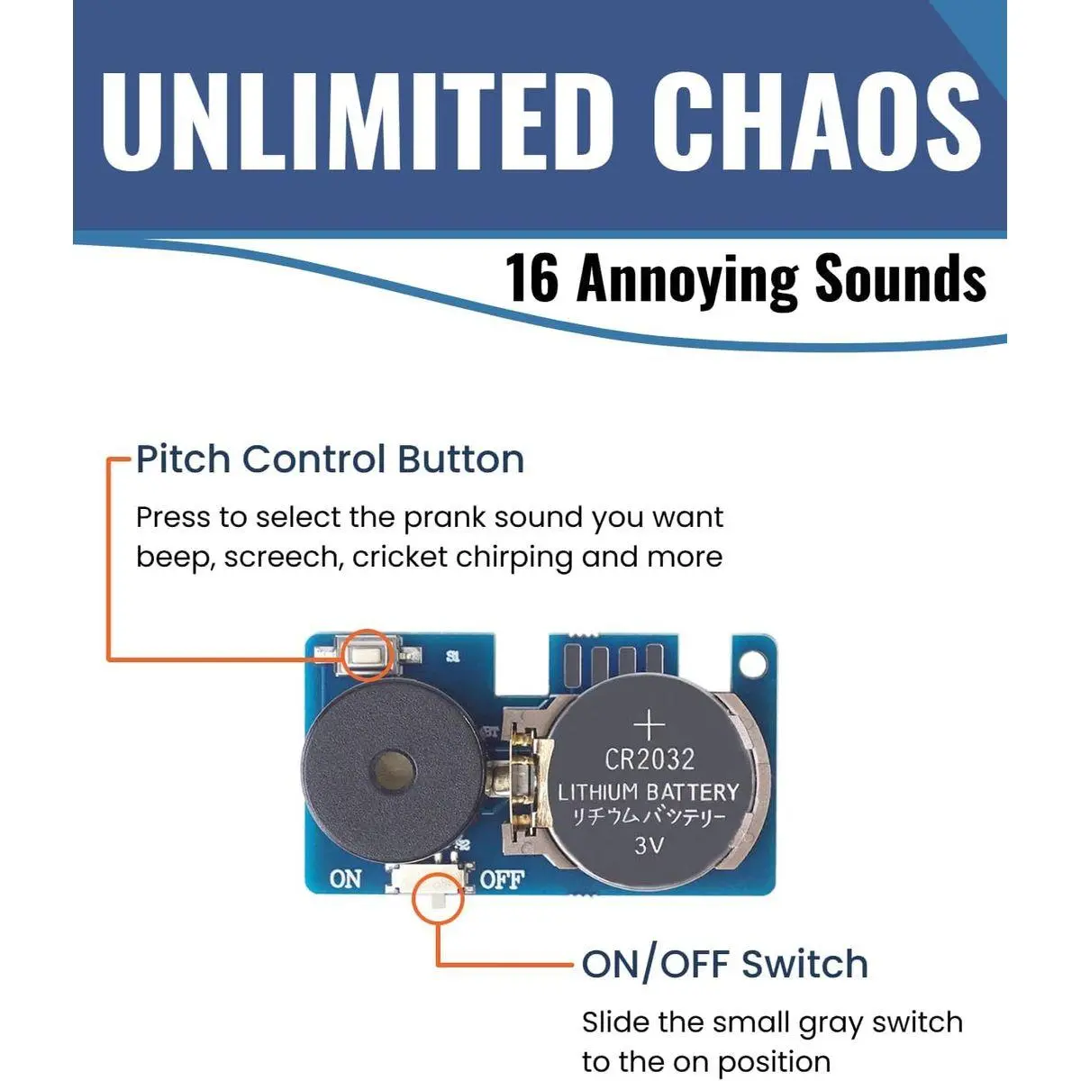 Multiple Sound Options: You're not stuck with just one choice of annoying sounds. With the press of a button, you can easily change the sound. The prank device can emit cricket sounds, bird chirps, telegraph sounds, alarm sounds, beeps, etc
