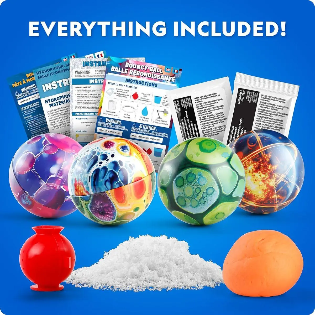FOUR FESTIVE SCIENCE EXPERIMENTS – Mold a colorful bouncy ball, create instant snow, make stretchy bouncing putty, and explore the amazing properties of hydrophobic sand!