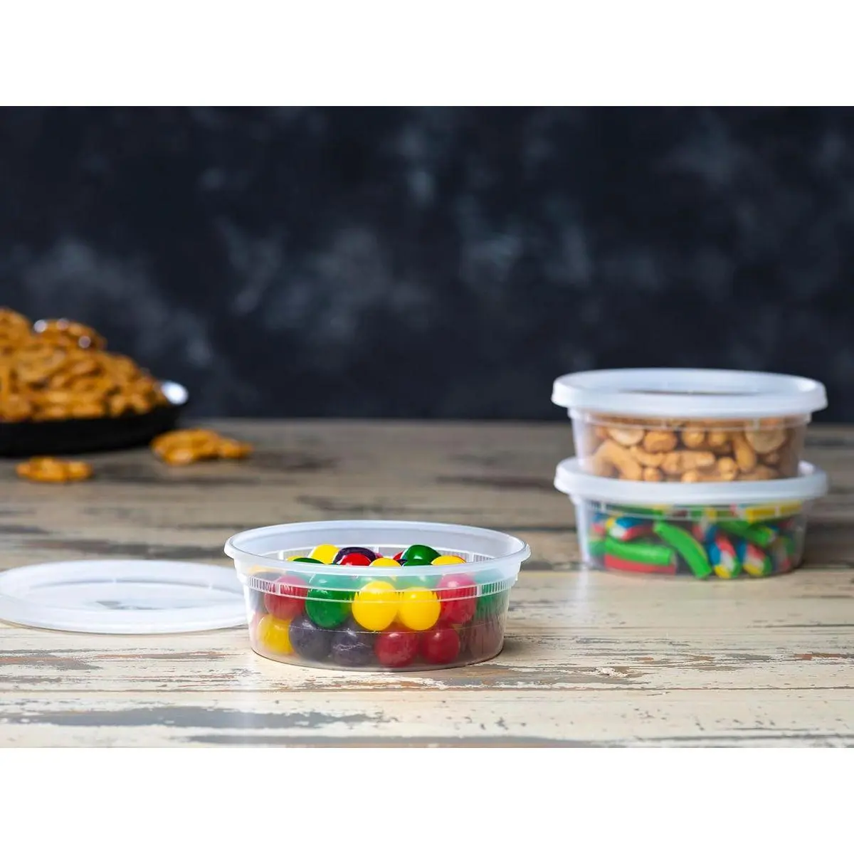 This 48-combo pack of 8-ounce containers are Ideal for Use at Home and Food Service Businesses. Excellent for Storing Soups, Stews, Deli Products like Chicken or Macaroni Salad, Nuts, and Small Quantities of Many Other Food Items.