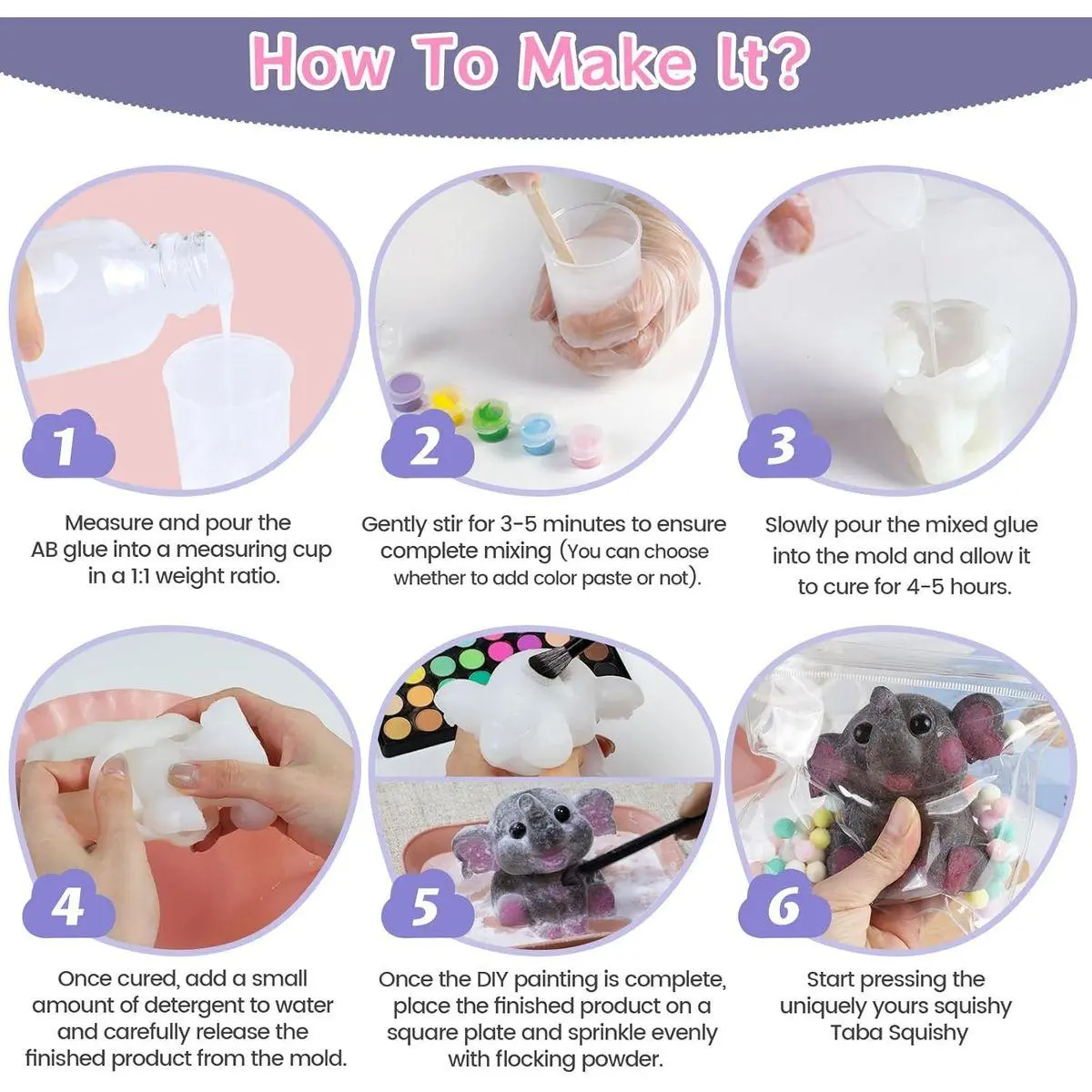 Tip: Flex rubber is only suitable for making Taba Squishies and cannot be used for mould making. Please read the instructions carefully before use. Approximately 175ml of silicone liquid (A+B) is needed to make an elephant, 120ml for crocodile, and 45ml for mini dog