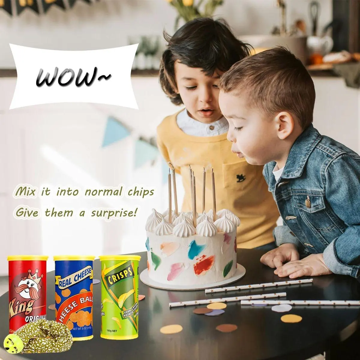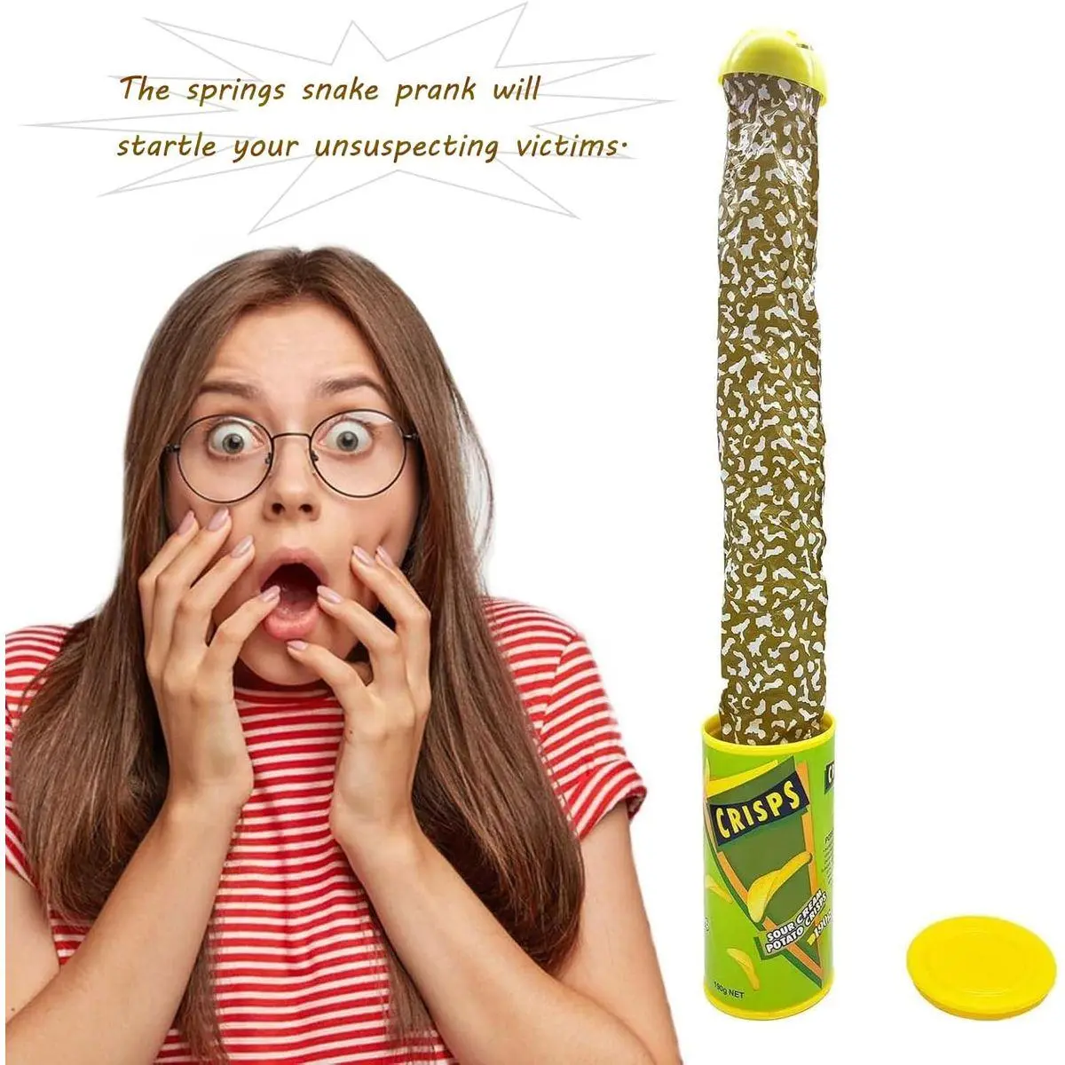 【Prank Toy for Kids】This is a normal cans of potato chips, when child open the cans,the snake darts from the cans by a surprise,give a big scare