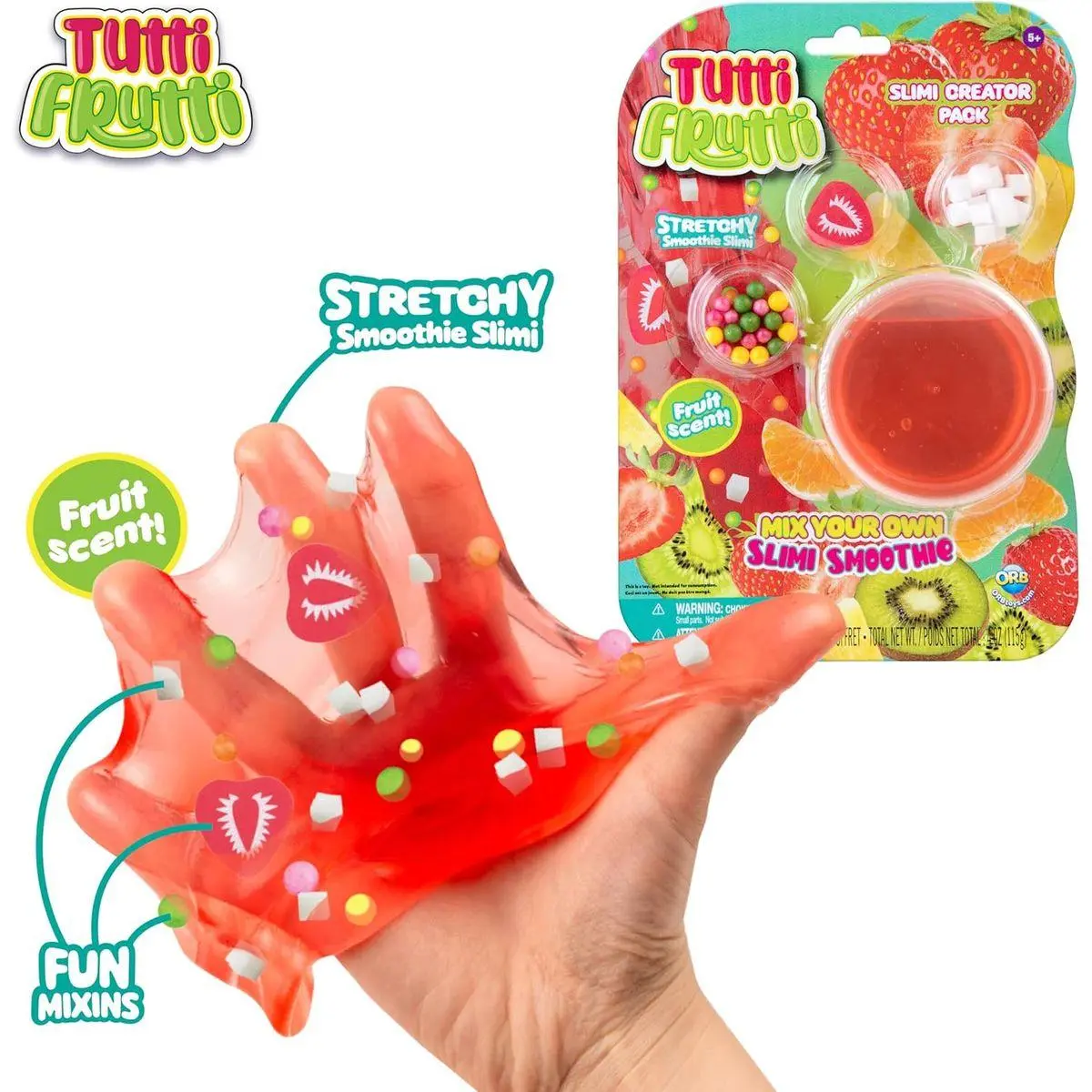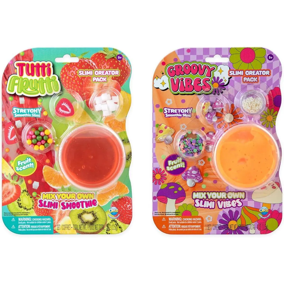 Each ORB Slimi Creator 2 Pack Includes 2 Individual Slimi Creator Kits, 1 Tutti Frutti Slimi Creator Kit and 1 Groovy Vibes Slimi Creator Kit. Each kit contains 1 3 oz container of fruity scented ORB Slimi slime and 3 fun mix-ins to create your own fun slime experience!