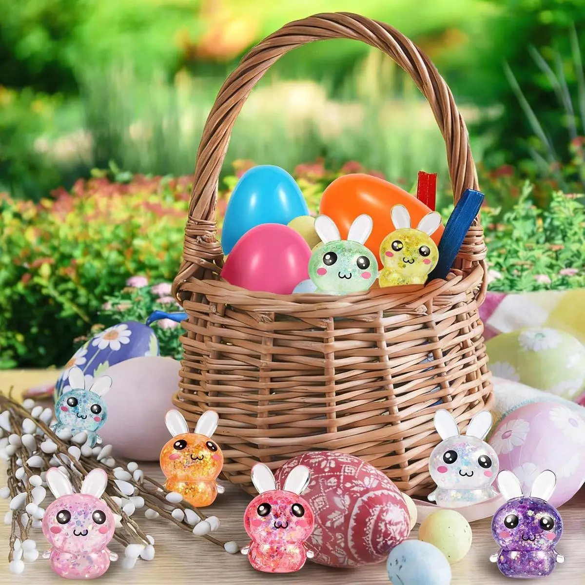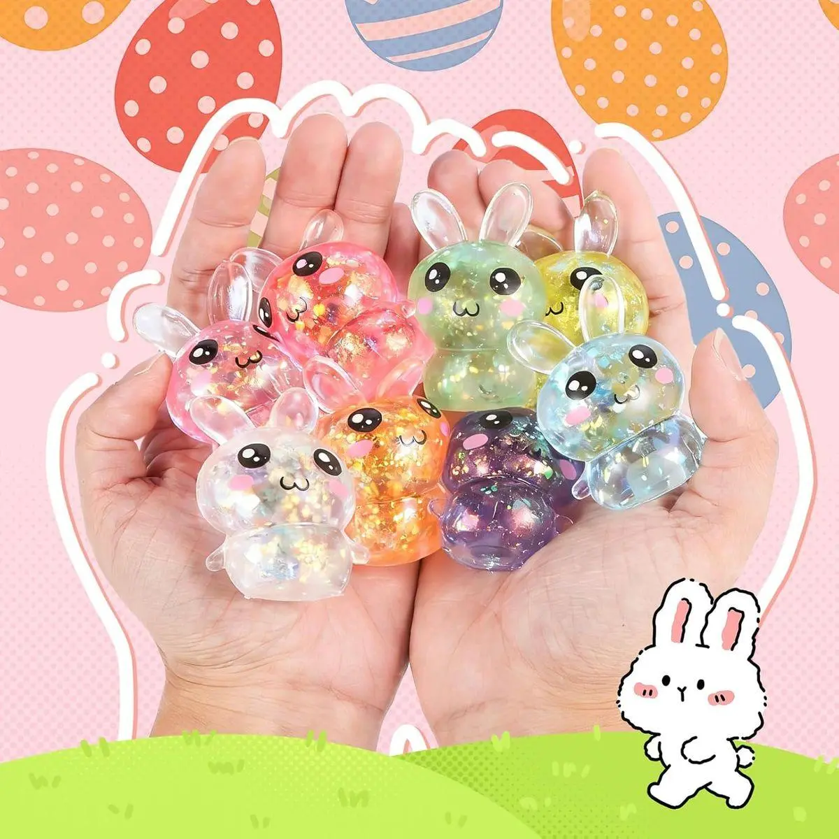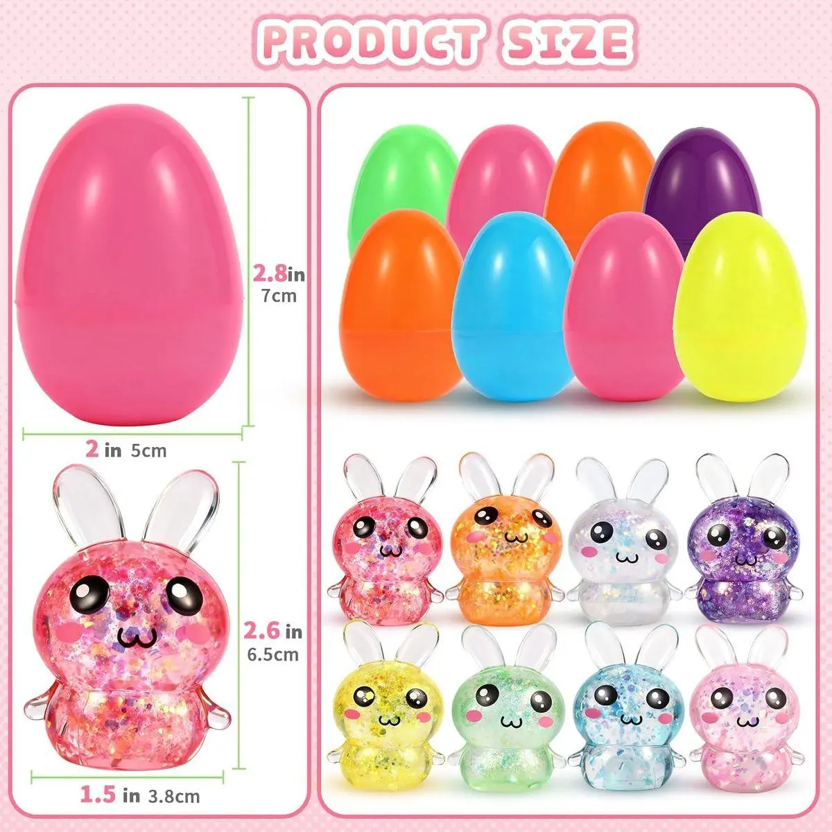 【Adorable Glitter Bunny Stress Balls】– Includes 8 colorful bunny squishy toys with sparkling glitter inside, each measuring 2.7 inches. It also includes 8 pcs 2" x 2.76" colored Easter eggs. Perfect for adding fun and excitement to any Easter celebration!