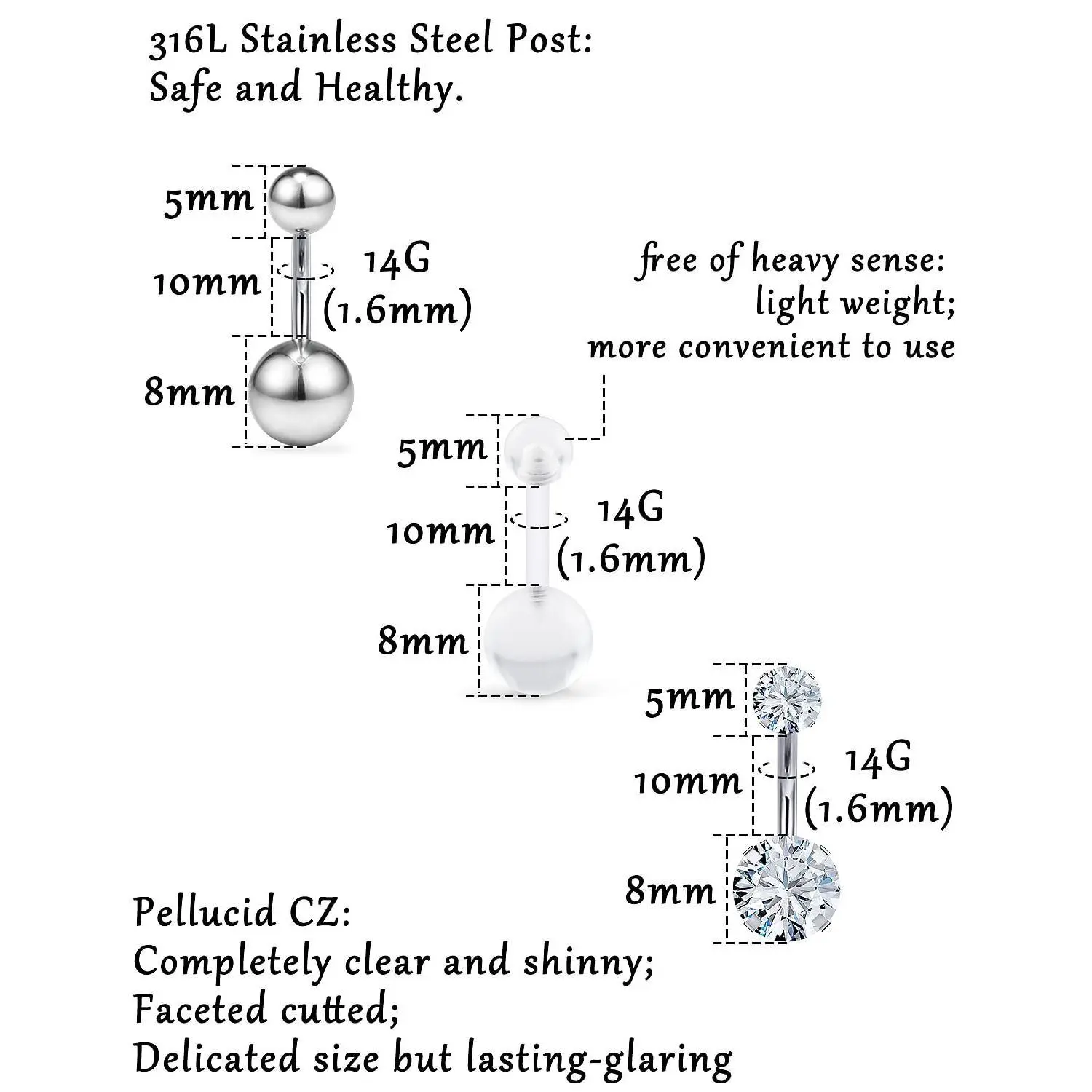 Belly Button Rings Bar Gauge 14G 1.6mm, Bar Length 3/8iinch 10mm, Gauge 12G 2mm, Gauge 14G 1.6mm.