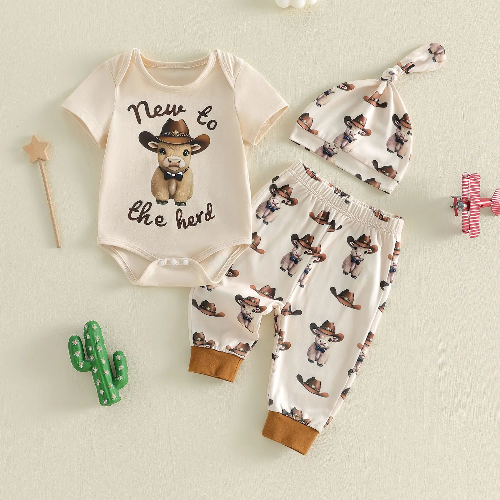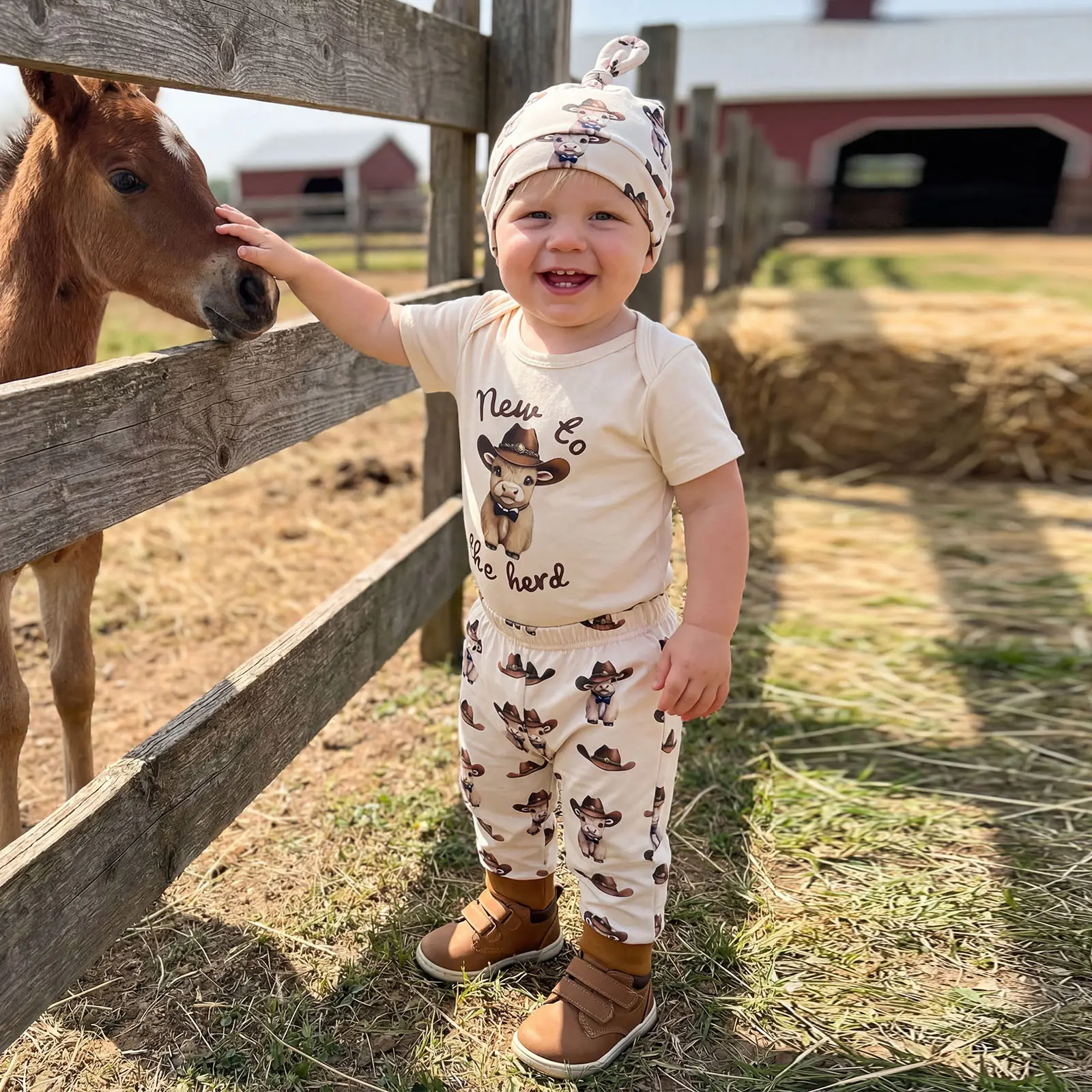 Every baby deserves a wardrobe full of cuteness, comfort, and personality! Our "New to the Herd" 3Piece Cowboy Outfit is designed to be the perfect blend of adorable western style and baby-first comfort, made for your little one's daily adventures, milestone photos, and snuggly nap times.
