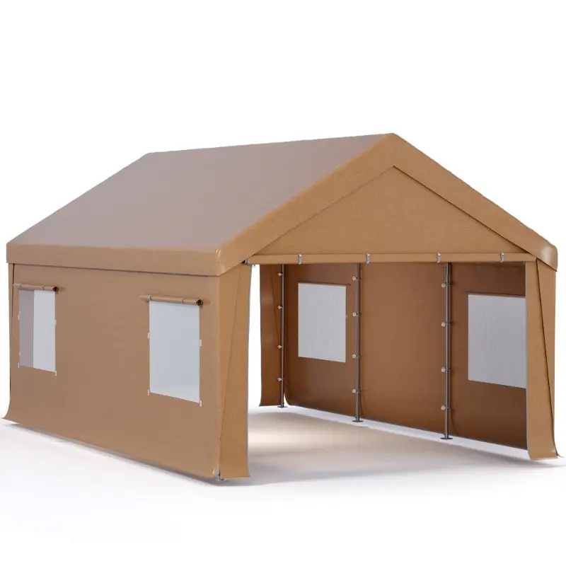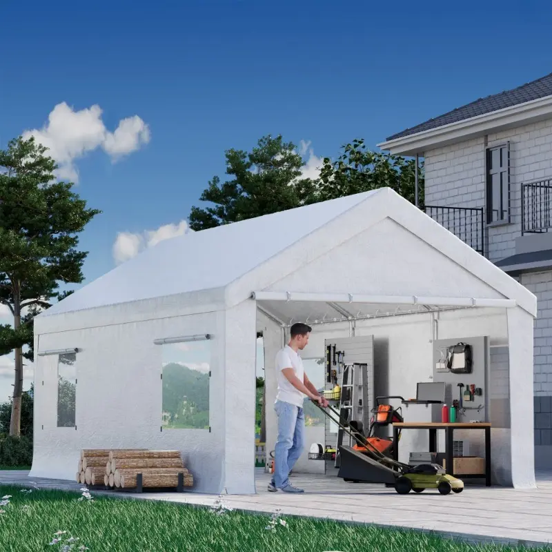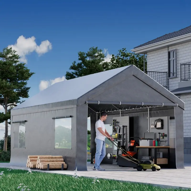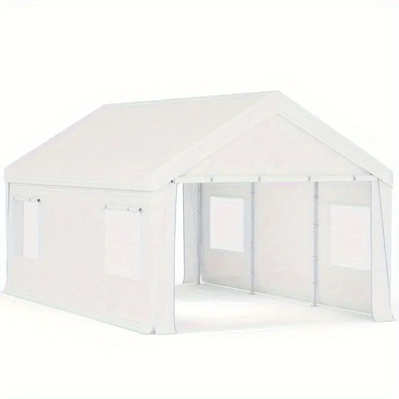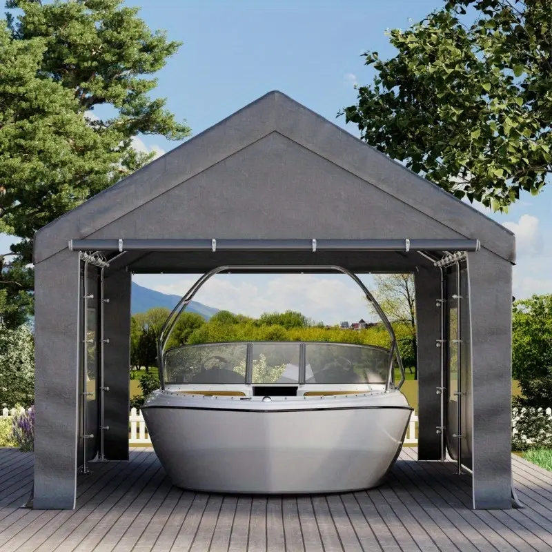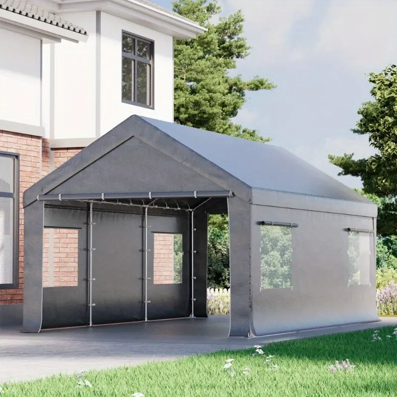 Designed for year-round use, the garage tent includes four ventilation windows on the side walls for optimal airflow, with outer curtains that can be rolled up or lowered depending on the weather.The structure of the Galvanized Steel Portable Garage is crafted from a three-layer, heat-sealed 180G polyethylene fabric that is both UV-resistant and rainproof, offering reliable protection from the sun, wind, rain, and snow.