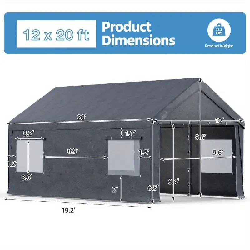 The fabric attaches securely to the frame using elastic balls and sturdy support feet. Foldable doors and windows provide versatility for seasonal use, and the carport is also suitable for events such as parties.With ample space of 12x20 FT, the portable garage can accommodate vehicles such as cars, boats, and other large items. It can also serve as an emergency shelter for storing food and water in times of need.