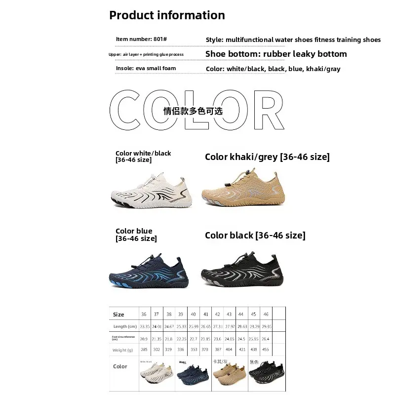 These new couple-style water shoes are perfect for creek trekking, beach activities, swimming, hiking, climbing and various outdoor adventures. Designed with a quick-drying, highly breathable upper, they efficiently drain water and allow air circulation, keeping feet fresh and dry all day long. The five-toe structure provides a natural, flexible fit, enhancing toe grip and balance on wet or rough surfaces.