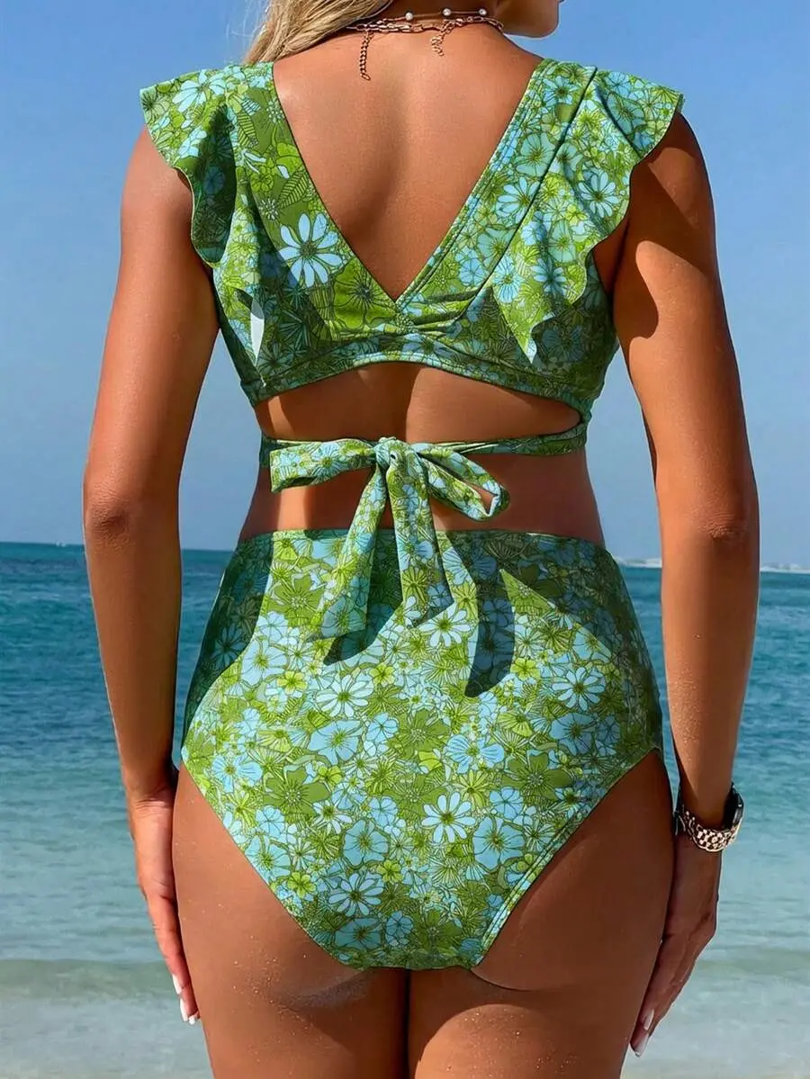 PRINCELY Maternity Floral V-Neck Ruffle High Waist Bikini Set For Summer Beach Vacation