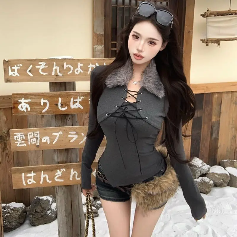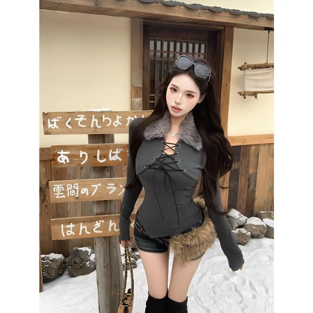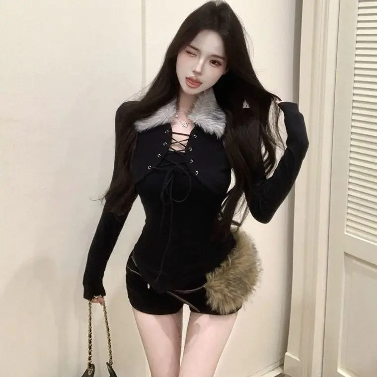 2026 Spring Long Sleeve Faux Fur Sweater Women 2000s American Vintage Pullover Korean Fashion Outwear Sexy Lace-up Blouse