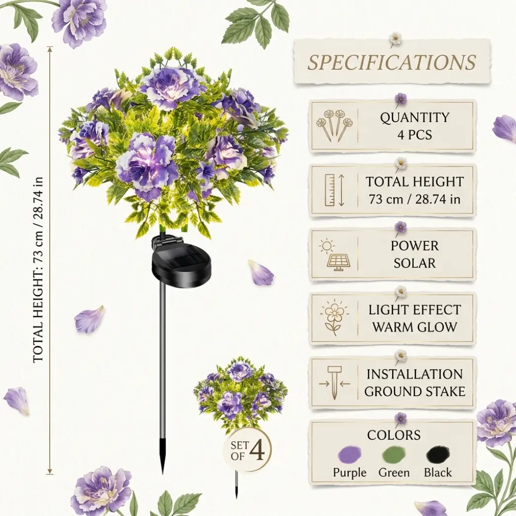 Add a charming glow to your outdoor space with these 4 Pack Solar Purple Carnation Flower Garden Lights. Designed with vivid purple carnation flowers and warm built-in lights, they bring a beautiful decorative touch to gardens, lawns, pathways, patios, and yards during both day and night.