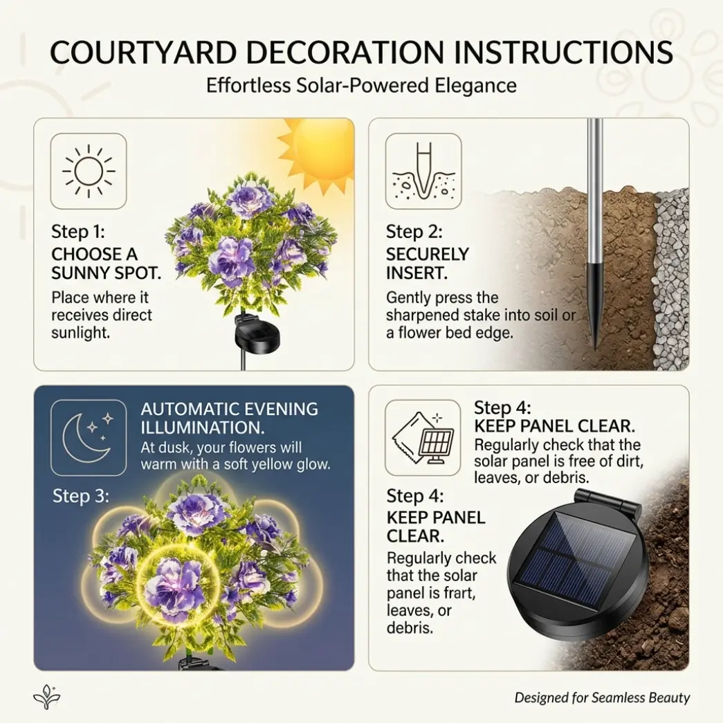 The solar panel charges during the day, and the lights turn on automatically at night for easy daily use. No wiring or outlet is needed, making installation simple and convenient. Just place them in the ground to create an elegant and eye-catching outdoor display.